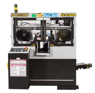 The H-230A is has the smallest footprint of HYDMECH’s automatic horizontal band saws. It’s split front vise for material clamping results in a short remnant length of 2.3″ during automatic operation, reducing material waste.