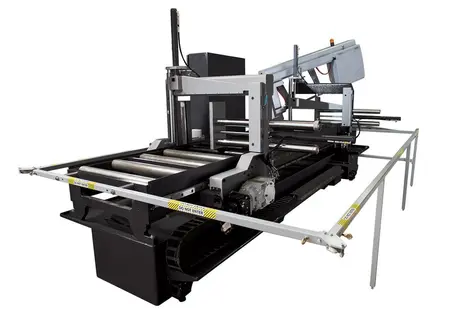 The M-20A-120 is a heavy-duty automatic horizontal pivot band saw, its ability to miter cut from 90 to 60 degrees makes it an excellent machine for large fabrication jobs. The machines PLC controller can be easily programmed, storing up to 99 different cutting jobs and includes a Job Queue function. The simple programming and user friendly controls switches minimize set up time and affords cost effective production. Equipped with a 120″ bar feed, its shuttle vise assembly capable of indexing up to 120” in a single stroke. Featuring a 20″H x 30″W capacity at 90°, 10 HP motor, and 1 1/2″ blade, the M-20A-120 is a reliable choice for your heavy-duty metal cutting applications.
