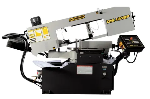 he DM-1318P double miter, semi-automatic band saw provides exceptional miter cutting for medium duty applications. Its versatile swing head with easy to read angle scale, saves operator time. The heavy-duty gearbox and motor assembly ensures the DM-1318P will deliver maximum productivity. The cast iron double swivel head features an easy to read angle scale and “quick” stops at 90, 45, and 60 degree positions. The cast iron vise slides on linear ways which can be easily positioned to either the left or right side of the head and includes a quick release mechanism for rapid positioning. Featuring a 13″H x 17 3/4″ W capacity at 90°, 5.5 HP motor, and 1 1/4″ blade, the DM-1318P is a versatile double miter band saw.