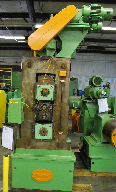 Machine #10647 SPECIFICATIONS: TYPE MILL: NON REVERSING 4 HIGH BONDING MILL WORK ROLL SIZE: 5" x 10" (127mm X 254mm) BACKUP ROLL SIZE: 10" x 10" (254mm X 254mm) WORK ROLL BEARING: ROLLER BACKUP ROLL BEARING: ROLLER BACKUP ROLL INTERNAL COOLED WINDOW OPENING WIDTH: 10-5/6" (262mm) MILL COLUMN X-SECTION: 7-3/4" x 5-3/4" (197mm X (146mm) POWER SCREWDOWN: 1-1/2 HP, 220/440 V, 3 PH, 60 CYC MILL REDUCER: FALK 84.78 RATIO, 1150 INPUT RPM OUTPUT RPM 13.5, SERVICE FACTOR 1.54, SERVICE RATING HP 25, CHAIN RATIO .875 DRIVE MOTOR: 25 HP, 500 V D.C., 1150/2300 RPM, 44 AMPS MILL SPEED: 15 TO 30 FPM ****NOTE: MILL IS MISSING ONE BACK UP ROLL AND MUST BE SUPPLIED BY PURCHASER*** **Temporary Specifications Subject to Revisions** **PRICE QUOTED AS IS WHERE SUBJECT TO PRIOR SALE** **ALL SPECIFICATIONS ARE SUBJECT TO VERIFICATION BY PURCHASER** |