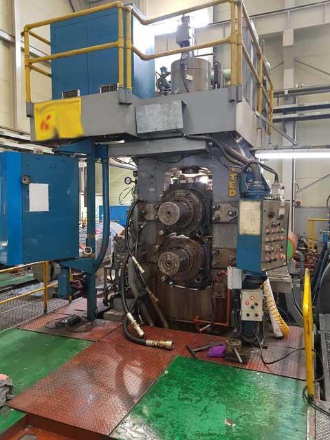 22" (558mm) x 33" (838mm) 2-HI TEMPER PASS MILL (13353) MACHINE# 13353 1. TECHNICAL SPECIFICATIONS: NEW PLC SYSTEM NEW THYRISTOR POWER CONTROL UNIT FOR PAY OFF REEL DC MOTOR NEW THYRISTOR POWER CONTROL UNIT FOR MILL DC MOTOR MATERIAL: MILD STEEL STRIP UP TO 1/4 HARD (ROCKWELL B69) FINISHING THICKNESS: 0.065" TO 0.010" COIL DIA: MAXIMUM 60", MINIMUM 32" COIL WIDTH: MAXIMUM 25", MINIMUM 16" COIL WEIGHT: 1500# MILL SPEED (22" DIA ROLL): 757/1,514 FPM (400 x 1/3.045 x 22/12=757) WORK ROLL: 22" DIA MAXIMUM 8'-6 7/8" OVERALL LENGTH 2.PAY OFF REEL DC MOTOR: 100HP 350/1,200RPM 250VDC/300AMPS GEAR RATIO: 4.33/1 DRUM: HYDRAULIC COLLAPSE 23" MAXIMUM DIA, 19" MINIMUM DIA COIL CHARGING CAR: HYDRAULIC LIFTER CYLINDER 7" BORE 15" STROKE 750# WORKING PRESSURE HYDRAULIC CARRIAGE CYLINDER 5" BORE 4'3" STROKE. STRIPPER: CYLINDER 3" BORE 26 1/2STROKE 750# WORKING PRESSURE 3.MILL DC MOTOR: 300HP 400/800RPM 250VDC/970AMPS GEAR RATIO: ROLL SCREW DOWN: HYDRAULIC CYLINDER 16" BORE 3 7/8" STROKE 6000PSI x 2 SET, MOOG VALVE PID POSITION CONTROL, HYDRAULIC PUMP PF4015-1593 DYHEX/RIVRTT 4.TENSION REEL DC MOTOR: 200HP 350/1200RPM 230VDC/710AMPS GEAR RATIO: 4.32/1 COIL DISCHARGING CAR: LIFTER CYLINDER 7" BORE 19 3/4" STROKE 750# WORKING PRESSURE COIL CAR CARRIAGE CYLINDER: 5" BORE 6'STROKE 750# WORKING PRESSURE. COIL STRIPPER: 3" BORE 26 1/2" STROKE 750# WORKING PRESSURE 5.ENTRY AND EXIT DEFLECTOR ROLL: 8" DIA 30" FACE 6.ENTRY AND EXIT HYDRAULIC SYSTEM TANK CAPACITY: 500 GALLON VICKERS PUMP: MODEL V-144-10, 33.5G.P.M. @ 1000#/?" MOTOR: 25HP 1200RPM x 2 SET 7.ROLL BALANCE HYDRAULIC SYSTEM TANK CAPACITY: 30 GALLON BALANCE CYLINDER: 2" DIA OPERATOR AT APPROX 1200PSI MOTOR: 5HP AC440V 1200RPM 8.GEAR LUBRICATION SYSTEM TANK CAPACITY: 700 GALLON PUMP: 15G.P.M. @ 60 PSI x 2 SET MOTOR: 1 1/2HP AC440V 1200RPM x 2 SET 9.MORG OIL LUBRICATION TANK CAPACITY: 700 GALLON PUMP MOTOR: 1.5KW AC440V 1145RPM x 2 SET 10.WORK ROLL POLISHING DEVICE 11.MCC CONTROL PANEL 12.PLC PANEL: MELSEC PLC (JAPAN) 13.DC MOTOR THYRISTOR CONTROL PANEL PAY OFF REEL: EUROTHERM 590P/0380/500 x 1 SET MILL: EUROTHERM 590P/830/500 x 1 SET TENSION REEL: GENERAL ELECTRIC x 1 SET 14.OPERATION CONTROL PANEL x 1 SET 15.LAYOUT 16.SPARE PARTS SCREW DOWN HYDRAULIC PUMP PF4015-1593 x 1 EA. GEAR PUMP 80BV x 1 EA. METAL BEARING DIA. 420 x L400 x 1 EA. WINDER DRIVE GEAR DIA. 900 x 8260B x 1 EA. WINDER PINION GEAR DIA. 300 x L1000 x 1 EA. ** SPECIFICATIONS SUBJECT TO REVISIONS ** ** SPECIFICATIONS SUBJECT TO VERIFICATION BY PURCHASER ** ** PRICE QUOTED AS IS WHERE IS SUBJECT TO PRIOR SALE ** |