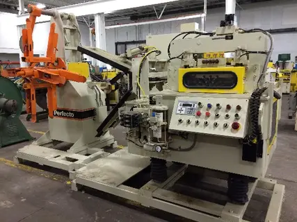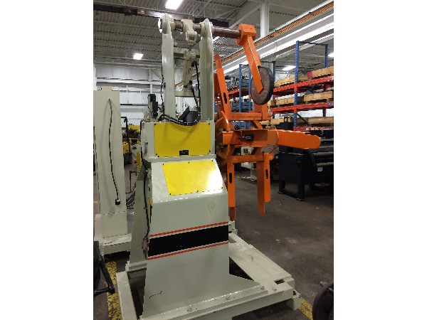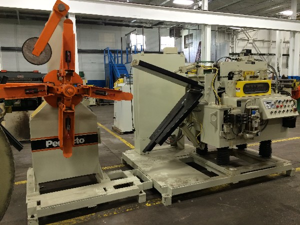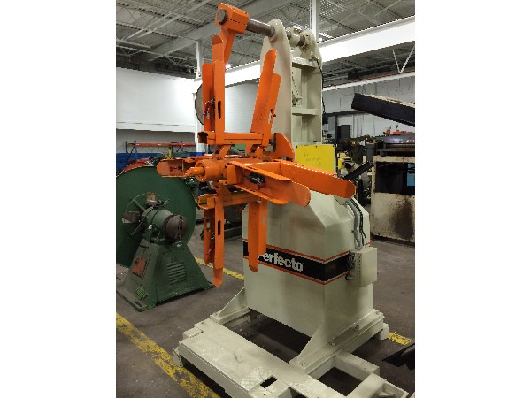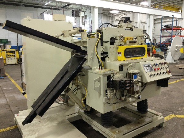 Coil weight capacity: 6,000 Lbs. Max coil width capacity: 12" Max stock thickness capacity: .085" @ 12" Wide Max stock thickness capacity: .093" @ 08" Wide Coil ID capacity: 16"-20" Coil OD capacity: 60" Equipped With: Perfecto Coil Reel Model No.: RS046012M Front mounted link type manual expansion Four leaf mandrel Quick release coil keeper arms Air operated coil hold down arm Thread drive for jog forward and reverse via selector switch Variable speed drive system Auto/Run cycle Perfecto Servo Feed Straightener Combination Model No.: FS171207 Entry and exit pinch rolls Air operated pinch roll adjustments Seven straightening rolls x 1.750" diameter Individual/Unison upper straightening roll adjustments Piloting upper straightening bank Upper and lower stock peeler tables Lower peeler table blade extension (air actuated) Adjustable stock width edge guides Drive and controls Auto/Run Cycle "As-Is" Warranty: Standard MDNA thirty day return privilege Terms: 40% Deposit, net prepaid |