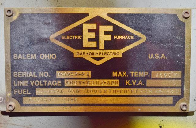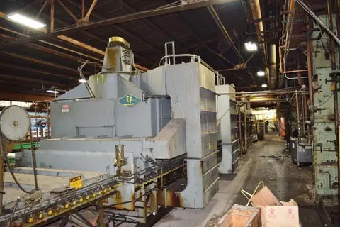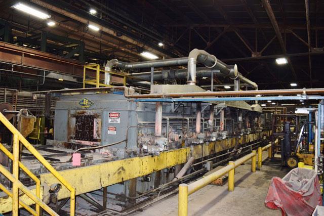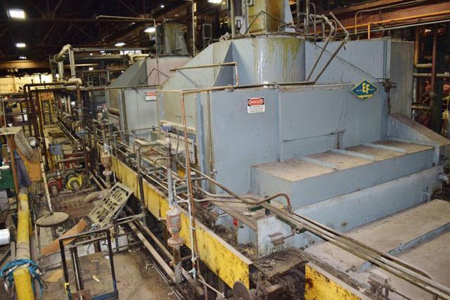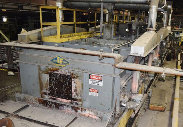 80" (2032mm) E.F.C.O. Roller Hearth Bright Anneal for Copper Tube Coils (13708) MACHINE# 13708 SPECIFICATIONS: MANUFACTURER: ELECTRIC FURNACE CO. (U.S.A.) TYPE: ROLLER HEARTH RADIANT TUBE FOR COPPER TUBING BRIGHT ANNEALING. YEAR OF MANUFACTURE: 1995 MAXIMUM TEMPERATURE: 1550 DEG. F (843 DEG. C) NORMAL OPERATING TEMPERATURE: 1300 DEG. F (704 DEG. C) GAS-FIRED RADIANT TUBE FORCED AIR CIRCULATION ATMOSPHERE CONTROLLED: NITROGEN HYDROGEN MIX PRODUCT: COPPER TUBE IN SINGLE LAYER PANCAKE COILS LAID TWO ACROSS. MAXIMUM COIL DIAMETER: 39" (990mm) ANNEALING CAPACITY: 8000 LBS./HR. (3628 KG/HR.) No. OF ZONES: 3 No. OF BURNERS: 20 ZONE 1 (22 FT. 6 IN.) 10 ZONE 2 (11 FT. 3 IN.) 6 ZONE 3 (11 FT. 3 IN.) 4 No. OF RECUPERATORS: 10 IN ZONE 1 DIMENSIONS: INSIDE WIDTH BETWEEN ROLL COLLARS: 6' 8" (2032mm) ACTUAL WIDTH OF HEATING CHAMBER: 7' 1" (2159mm) LENGTH OF CHARGE VESTIBULE: 8' (2.4m) INSIDE LENGTH OF HEAT CHAMBER: 45' (13.7m) LENGTH OF JET HOOD SECTION: 26' (8m) LENGTH OF DISCHARGE VESTIBULE: 8' (2.4m) OVERALL LENGTH: 96' (29.26m) LOADING HEIGHT ABOVE FLOOR LEVEL: 3' 4" (1036mm) CLEARANCE HEIGHT ABOVE TOP OF ROLLS: 0' 3" (92mm) ROLL LOAD (MAXIMUM): 50 LBS. (22 KG)/ROLL 100 LBS. (45 KG)/LINEAL FT. FURNACE IS INSTALLED BUT NOT RUNNING. ** SPECIFICATIONS SUBJECT TO REVISIONS ** ** SPECIFICATIONS SUBJECT TO VERIFICATION BY PURCHASER ** ** PRICE QUOTED AS IS WHERE IS SUBJECT TO PRIOR SALE ** |