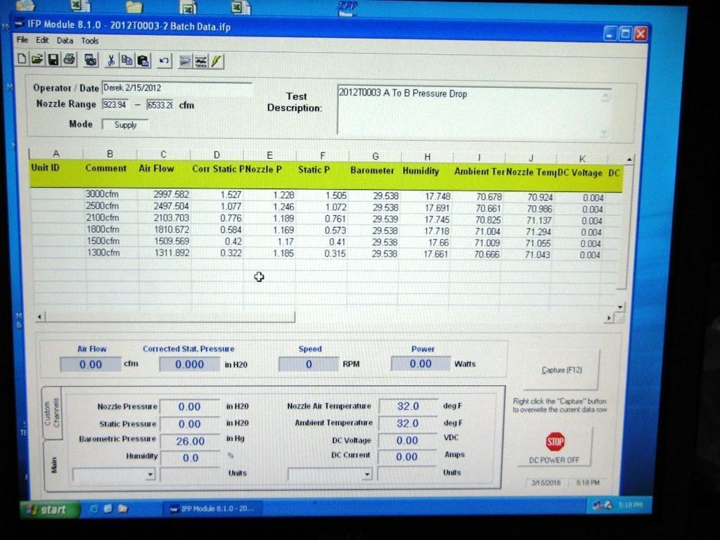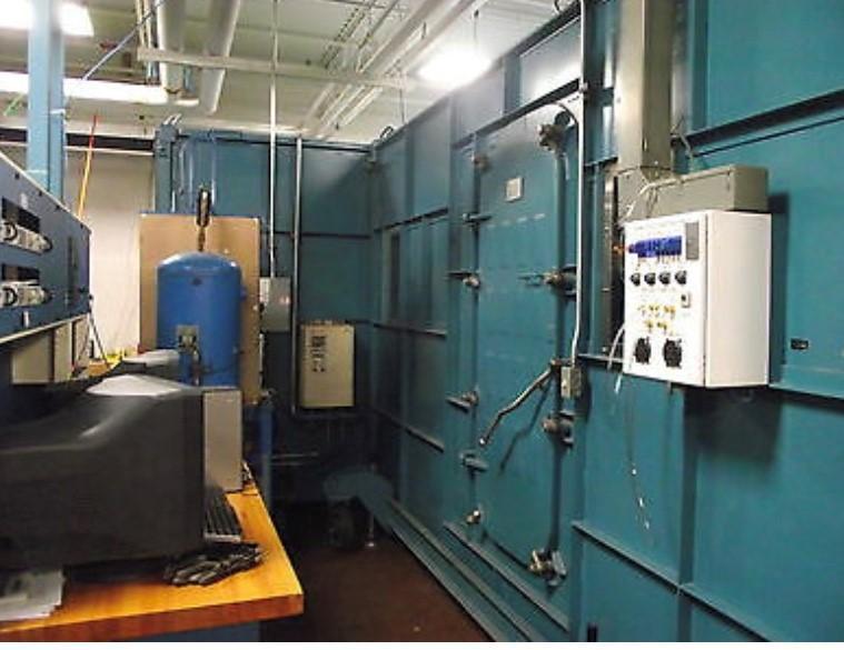 Specifications 6000 cfm tunnel, air flow measured by a family of 9 ASME flow nozzles; 2 each of: 2”, 3”, 4”, 6”& one 8” diameter. 20 hp variable speed blower with electrically controlled damper, for additional control 2 separate chambers that combine, 1 contains the blower and nozzles the other chamber able to be attached to the first in either the exhaust or supply modes. The In addition to the testing mentioned above the unit could be used for the airflow measurement portion of condenser calorimeter testing, smaller radiators and some charge air coolers. original PC contains the DMAT software used for testing.