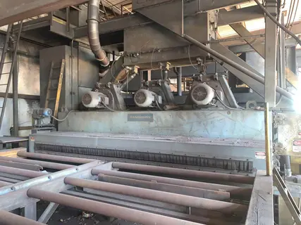 SYSTEM CONSISTS OF: - MATERIAL HANDLING LOADING WITH VACUUM LIFT - ENTRY ROLLER CONVEYOR - 6 WHEEL ROTOBLAST COMPARTMENT - BRUSH OFF/BLOW OFF COMPARTMENT - EXIT ROLLER CONVEYOR ROTOBLAST COMPARTMENT: SERIAL ................... ES1923/S890714 NEW ...................... 1990 MODEL .................... ES-1923 ROTOBLAST TOP & BOTTOM BLASTING .... YES WIDTH OF OPENING ......... 162" HEIGHT OF OPENING ........ 4" MAX NUMBER OF SHOT WHEELS .... 6 WHEEL CONFIGURATION ...... 3 TOP / 3 BOTTOM WHEEL MODEL .............. 240DD-4RI WHEEL MOTORS ............. 25 HP EACH, 1800 RPM WHEEL DRIVES ............. DIRECT POWER ROLLERS ............ (6) X 6-5/8" DIAMETER MEDIA SEPARATOR & RECLAIM SYSTEM: AUTOMATIC REPLENISHER .... YES ELEVATOR ................. BUCKET TYPE ELEVATOR MOTOR ........... 7.5 HP SEPARATOR ................ "AIRWASH" POWER ROLLERS ............ (2) X 6-5/8" DIAMETER BRUSH & BLOW OFF STATION: BRUSH OFF ................ 5 HP BRUSH BLOW OFF ................. 10 AIR NOZZLES LOADING IN-FEED ROLLER CONVEYOR: LENGTH ................... 40' WIDTH .................... 15' CONFIGURATION ............ (2) 80" LANES ROLLER DIAMETER .......... 3-1/2" ROLLER CENTERS ........... 18" VARIABLE SPEED DRIVE ..... YES UNLOAD OUT-FEED ROLLER CONVEYOR: LENGTH ................... 40' WIDTH .................... 15' CONFIGURATION ............ (2) 80" LANES ROLLER DIAMETER .......... 3-1/2" ROLLER CENTERS ........... 18" VARIABLE SPEED DRIVE ..... YES DUST COLLECTOR: CAPACITY ................. 6700 CFM MODEL .................... 20CP5RP PANGBORN CONTROL PANEL: WHEEL HOUR METERS ........ YES WHEEL LOAD INDICATOR ..... YES CONVEYOR CONTROLS ........ YES EMERGENCY STOP BUTTON .... YES |