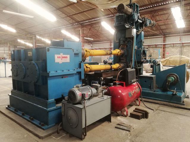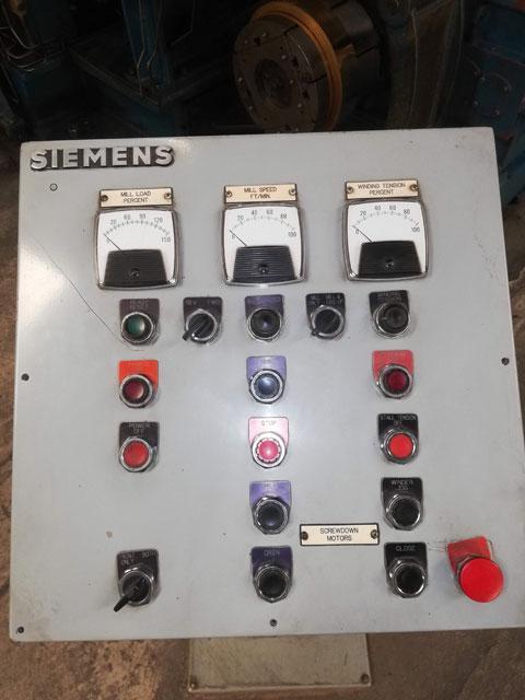 3.5"(88.9mm) X 11"(280mm) X 14"(356mm) BHS-TORIN 2/4 HIGH ROLLING MILL (13795) MACHINE 13795 MANUFACTURER: BHS-TORIN, FARMINGTON, CT USA TYPE MILL: 2/4 HIGH ROLLING MILL WORK ROLLS: 3.5" (88.9mm) DIAMETER X 14" (356mm) WIDE BACK UP ROLLS: 11" (279mm) DIAMETER X 14" (356mm) WIDE BACK UP ROLL DRIVEN MILL SCREW DOWNS: ELECTRO MECHANICAL POWERED SPEED RANGE 2 HI CONFIGURATION 0-50 FPM WITH CONSTANT HP FROM 35 FPM 4 HI CONFIGURATION 0-100 FPM WITH CONSTANT HP FROM 50 FPM MILL DRIVE MOTOR: 60 HP, 650/1750/1950 RPM DC MOTOR PLANT POWER SUPPLY: 460 VOLTS, 3 PHASE, 60 HERTZ 200 AMPS FULL LOAD MATERIAL TO BE ROLLED: COPPER & BRASS INGOTS 2 HI CONFIGURATION: MAX 1" (25.4mm) THICKNESS MAX WIDTH 10" (254mm) 4 HI CONFIGURATION: MAX 0.100" (2.54mm) THICKNESS MAX 10" (254mm) WIDTH MILL IS STILL INSTALLED **Catalogue Specifications*** **Temporary Specifications Subject to Revisions** **PRICE QUOTED AS IS WHERE IS SUBJECT TO PRIOR SALE** **ALL SPECIFICATIONS ARE SUBJECT TO VERIFICIATION BY PURCHASER** See this item on our web site: http://inv.mcmillanconroy.com/q/webinv/005249=x,13795 |