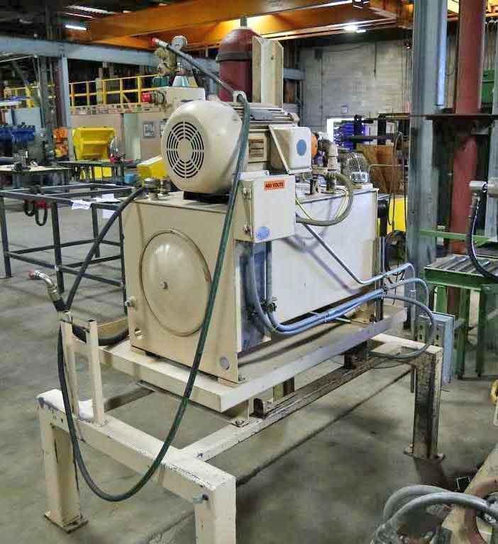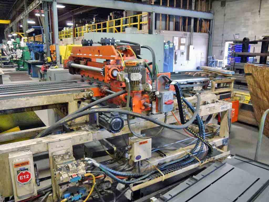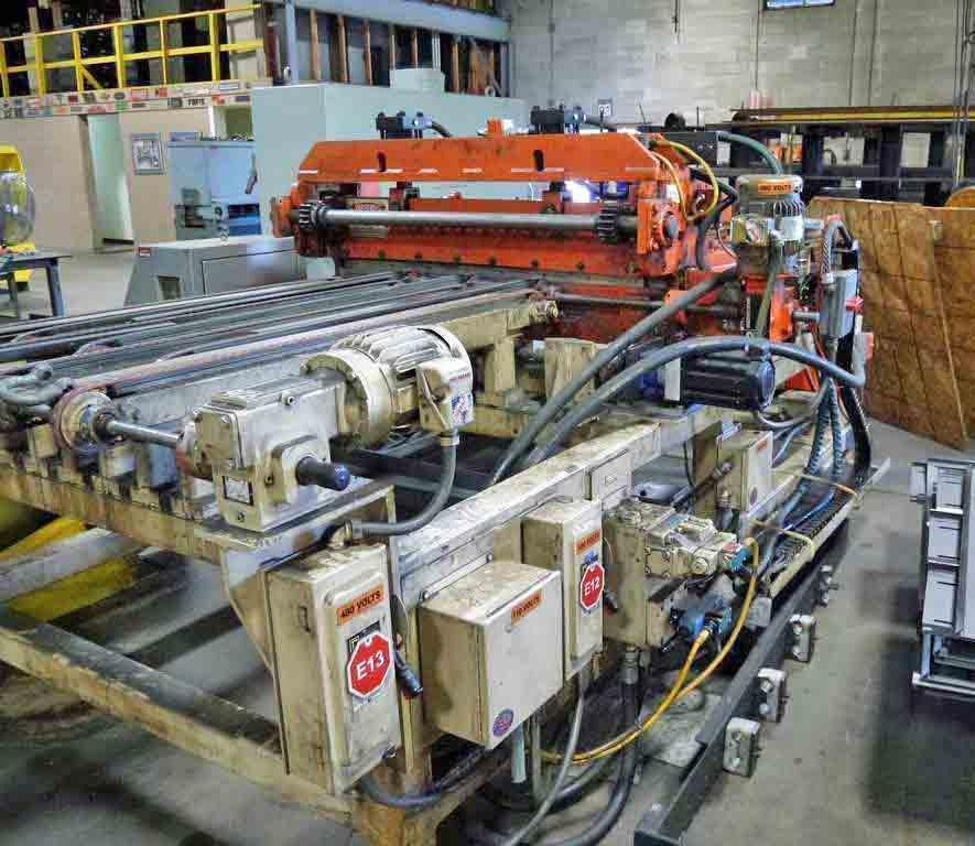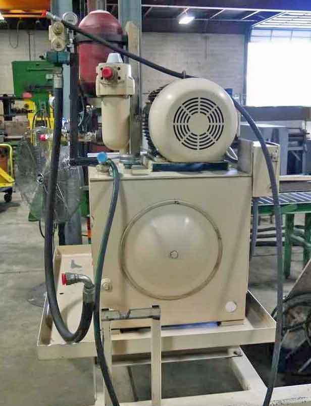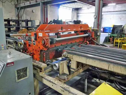 -Material Thickness: 0.036" Maximum, 0.015" Minimum -Maximum Yield: 35,000 psi -Four (4) side high carbon - high chrome shear blades, upper bowtie, lower straight rake blade. -Strokes Per Minute: 170 (40 Cuts Per Minute) -Shear ram actuated through two (2) heavy duty hydraulic cylinders and rides on replaceable bronze wear plates. -Rack & Pinion Shear Ram Design. -Non-Marking Stripper Bar. -Includes Dedicated Hydraulic Power Unit for Shear actuation. -Complete controls with start/stop/crop/inch buttons. -Shear head mounted on adjustable slide base adjusted through precision jack screws via AC gear motor to handle lengths from 72" - 96.50". -Shear mounting includes squaring adjustment to allow cuts to be taken out of perpendicular to the line's center axis. This provides for slight compensation to be made to attain even diagonal measurements on sheets produced from cambered material. -Two (2) hardened roller type entry guide assembly is mounted on shear and includes a +/- 1/2" lateral micro-adjustment with center indicating position pointer. This single point adjustment allows for slight off-center positioning of the incoming strip. -Guides are adjusted relative to centerline through left and right hand acme screw arrangement with a hand wheel. -Exit Powered Belt Conveyor section. |