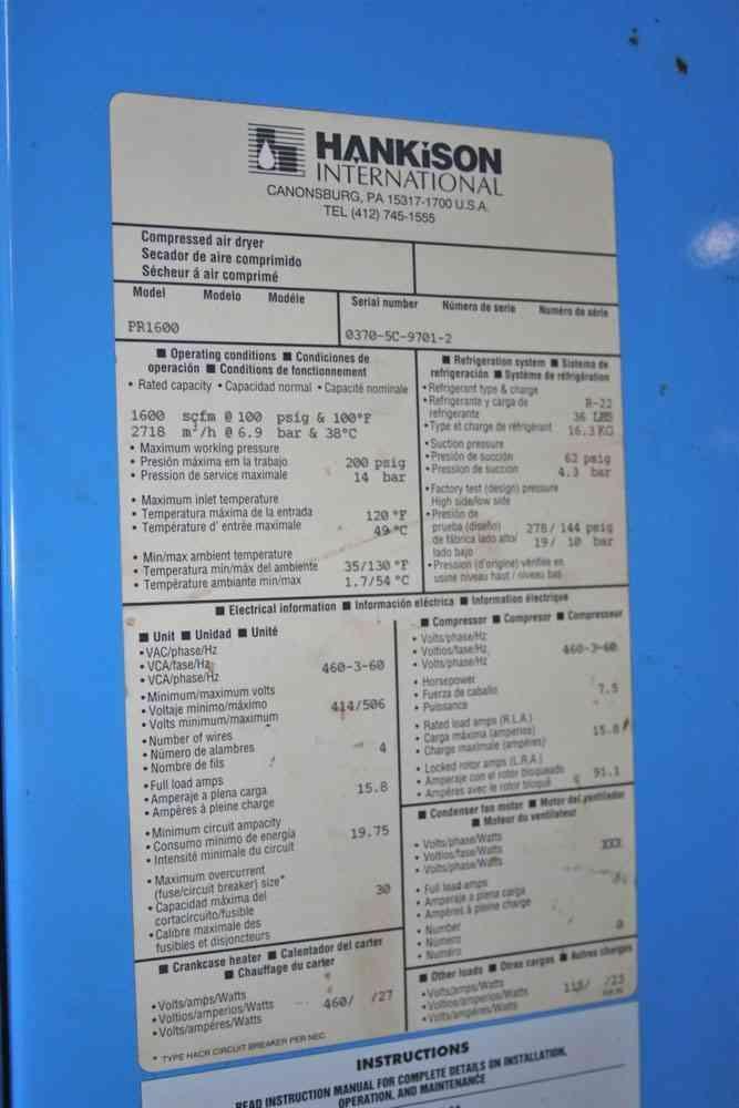 SERIAL ............................... #0370-5C-9701-2 MODEL ................................ #PR1600 NEW IN ............................... 1997 SCFM ................................. 1600 MAXIMUM WORKING PRESSURE ............. 100 PSI MAXIMUM AMBIENT TEMPERATURE .......... 120 DEGREES MAXIMUM INLET AIR PRESSURE ........... 100 PSI REFRIGENT ............................ R-22 AIR INLET DIMENSION .................. 8" AIR OUTLET DIMENSION ................. 8" AUTOMATIC DRAIN ...................... YES MOTOR ................................ 7-1/2 HORSEPOWER |