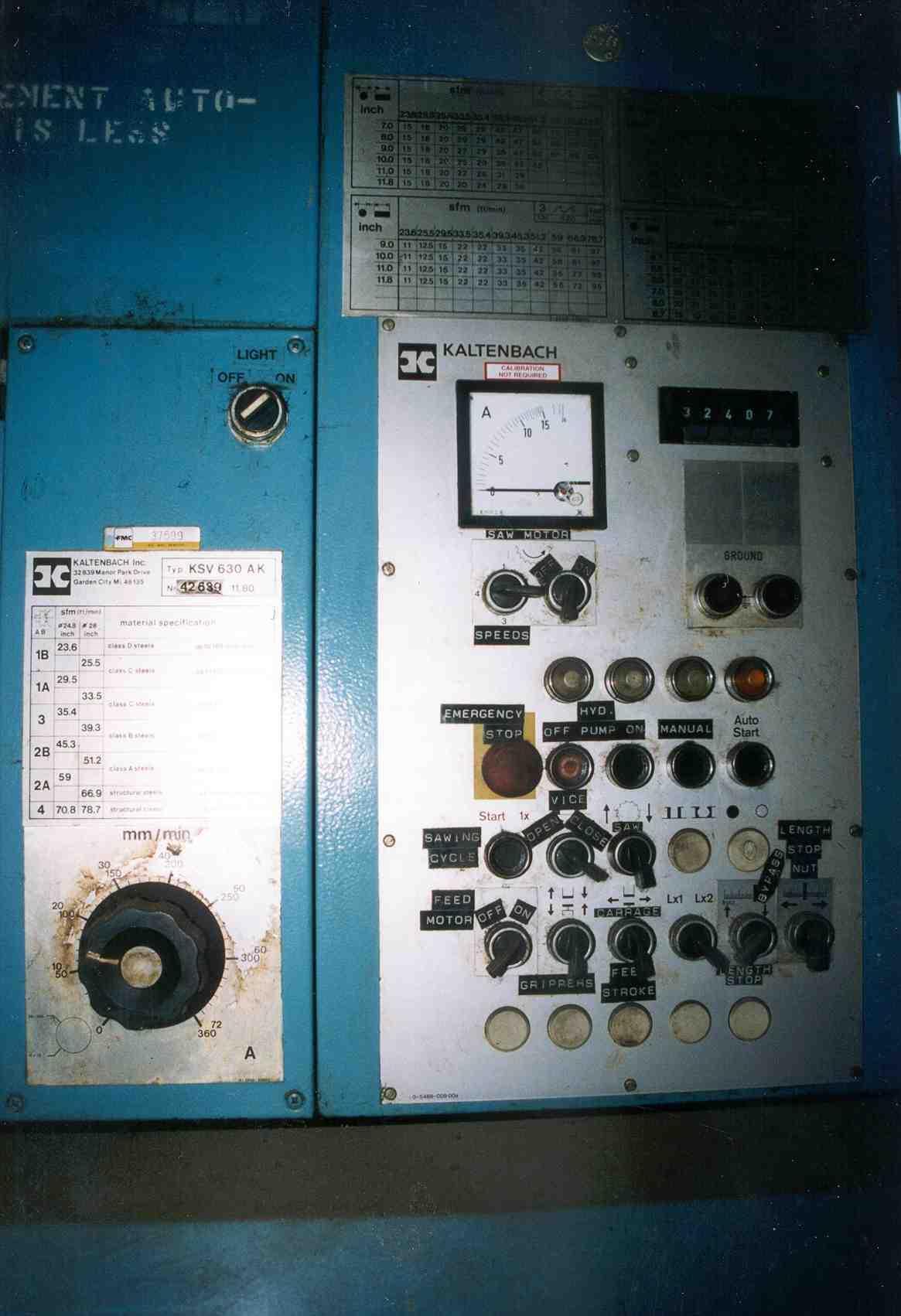 SERIAL ............................ 42639 MODEL ............................. KSV-630AK NEW IN ............................ 1980 DIAMETER OF BLADE ................. 28" CAPACITY RECTANGLES ............... 12" X 16" CAPACITY SQUARES .................. 7-1/2" CAPACITY ROUNDS ................... 9-1/8" CAPACITY H-BEAMS .................. 16" X 7" CAPACITY CHANNELS ................. 15"X 3-3/8" CAPACITY ANGLES ................... 8" X 8" BLADE SPEEDS ...................... 23.6 TO 78.7 SFPM AUTOMATIC CLAMPING ................ YES AUTOMATIC SPEED & FEED SELECTOR ... YES BALL SCREWS BLADE FEED ............ YES MOTOR ............................. 10 HORSEPOWER |