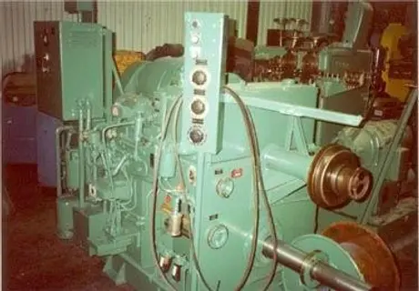 SERIAL NUMBER ...................................... 4369-SY2731 MODEL .................................................... 600 VARIABLE SPEED ........ 250 - 500 FPM WITH EDDY CURRENT CLUTCH SPINDLE SIZE .......... 3-1/4" DIAMETER X 12" LONG AIR CYLINDER SPOOL PUSH OFF .............................. YES LIMIT SWITCH STROKE ADJUST WITH HANDWHEEL ................ YES DWELL ADJUST WITH HYDRAULIC METERING HANDWHEEL LINKEAGE .. YES PITCH ADJUST WITH HYDRAULIC METERING HANDWHEEL LINKEAGE .. YES WIRE GUIDE WHEEL WITH 6" LOCATING ADJUSTMENT ............. YES 11" SPINDLE TRAVERSE ..................................... YES SUMP PUMP OIL FLOOD LUBRICATION TO BEARINGS AND WEAR SURFACES ........................................ YES TENSION CONTROL HANDWHEEL & GAGES FOR RUN & STANDBY ...... YES BRAKE DRAG CONTROL POST .................................. YES ELECTRICAL PUSH BUTTON STATION ........................... YES EDDY CURRENT CLUTCH FOR VARIABLE SPEED CONTROLLER ........ YES WARNER ELECTRIC BRAKE .................................... YES (4) SPOOLS - 600# CAPACITY - 12" BARREL DIA., 22" FLANGE DIAMETER, 11" TRAVERSE WIDTH, 3-1/2" BORE............... YES |
