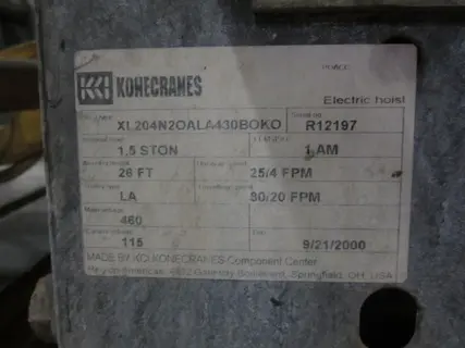 HOIST CAPACITY ..................... 1.5 TON BRIDGE CAPACITY .................... 2 TON LIFT ............................... 26 SPEED .............................. 25/4 FPM SPEED .............................. 80/20 FPM 921 2000 EXCEL 204N20AL4308BOKO |