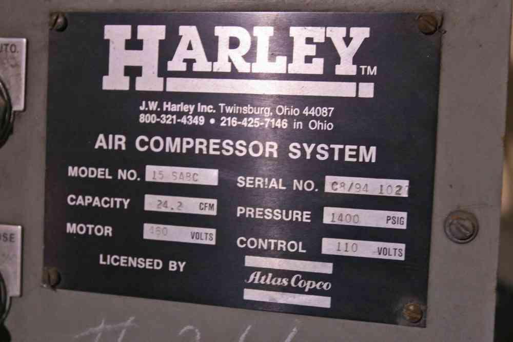 SERIAL ....................... C8/94102 MODEL ........................ 15SABC OPERATING PRESSURE ........... 1400 PSIG CFM .......................... 24.2 HOURS ........................ 568 HOURS PRESSURE GAUGES .............. YES 2 STAGE HEAD ................. YES SKID MOUNTED ................. YES WATER COOLED ................. YES MOTOR ........................ 15 HORSEPOWER |