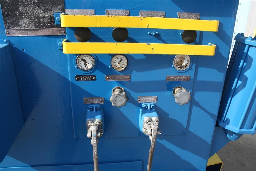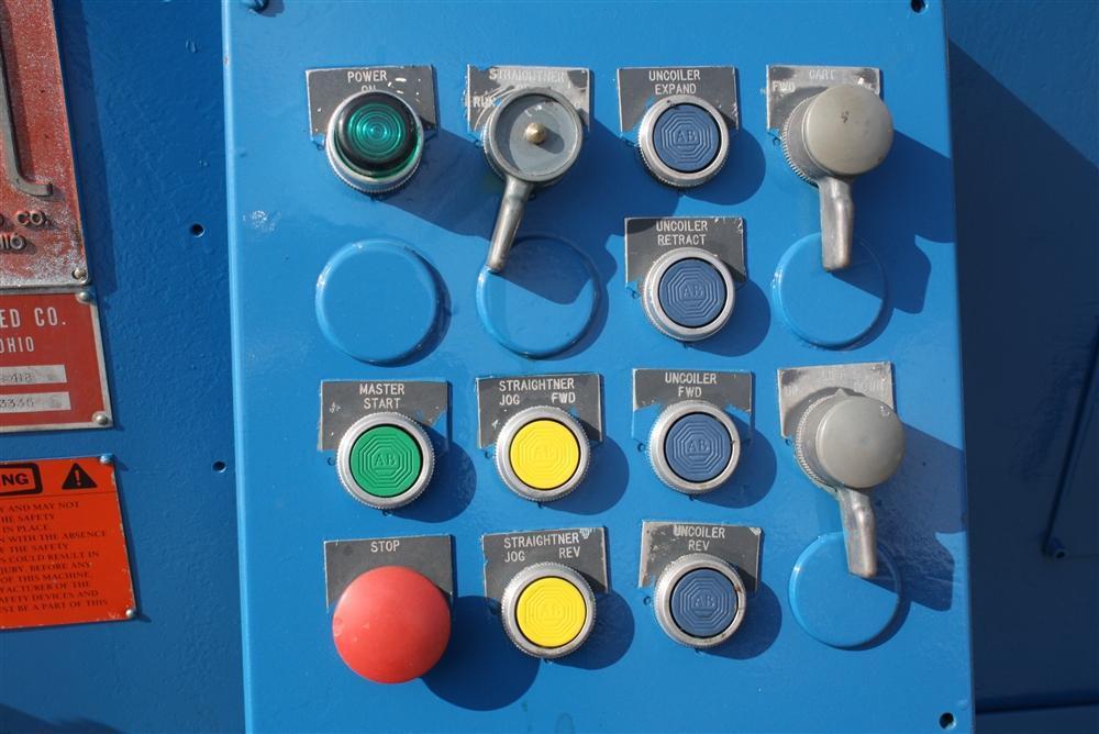 SERIAL ......................... 3335 MODEL .......................... 5-418 COIL WIDTH ..................... 7" MINIMUM TO 20" MAXIMUM COIL CAPACITY .................. .060 MIN TO .125 @ 18" WIDE COIL CAPACITY .................. .060 MIN TO .187 @ 7" WIDE STRAIGHTENER SPEED ............. 0 TO 1200 IPM ENTRY PINCH ROLLS .............. YES EXIT PINCH ROLLS ............... YES DIAMETER OF PINCH .............. 5" NUMBER OF STRAIGHTING ROLLS .... (5) 2 OVER 3 HYDRAULIC LIFT CYCLINDER ....... YES HOLD DOWN ARM .................. YES ADJUSTABLE GUIDE ARMS .......... YES MOTOR .......................... 10 HORSEPOWER |