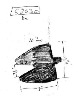 BOTTOM DIE LENGTH OF DIE..................... 10' WIDTH OF DIE...................... 2-7/8" HEIGHT OF DIE..................... 3" OPENING OF DIE.................... 1" SIZE OF HOLDING TANG.............. 1/2" |