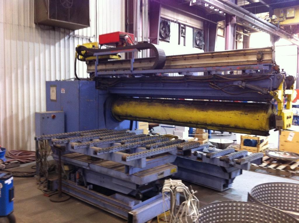 CYLINDER SEAM WELDER ............ 10' FLAT PLATE WELDING CLAMPING LENGTH ......... 120" INSIDE DIAMETER ................. 20" MIN OUTSIDE DIAMETER ................ 54" MAX CLOOS MIG WELDING PACKAGE INCLUDES: GLC 503 QUINTO POWER SUPPLY CK 78 DISD CONTROL *HYDRAULIC TILTING MANDREL W/POWERED ROTATION TO CHANGE FROM FLAT PLATE TO CYLINDERS. (2) ROLLER TOP HYD LIFT TABLES: PNEUMATIC LIFTING ARMS .......... YES AREA OF TABLES .................. 32" x 100" & 58" x 85" RISER PLATFORM .................. 5' X 10" FOOT PEDAL CONTROLLED PNEUMATIC MANDREL LATCH PNEUMATIC TORCH ALIGNMENT/ADJUSTMENT SWING OUT CONTROL ARM GAS PURGE BACK-UP BAR |