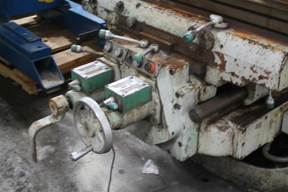 SERIAL ................................ 4A4V5T-3 MODEL ................................. 420-16 AREA OF TABLE ......................... 79-3/4" X 16-1/4" SPINDLE SPEEDS ........................ (24) 16 TO 1600 RPM LONGITUDINAL & CROSS FEEDS ............ (32) 3/8 TO 90 IPM VERTICAL FEEDS ........................ (32) 3/16 TO 45 IPM LONGITUDINAL TRAVEL ................... 42" CROSS TRAVEL .......................... 16" VERTICAL TRAVEL OF KNEE ............... 16" VERTICAL TRAVEL OF HEAD ............... 6" TAPER IN SPINDLE ...................... #50 NT DISTANCE SPINDLE TO TABLE ............. 0" MIN TO 22-1/8" MAXIMUM RAPID TRAVERSE ........................ 150 IPM VERTICAL RAPID TRAVERSE ............... 75 IPM DEPTH OF THROAT ....................... 18" COOLANT ............................... YES SPINDLE DRIVE MOTOR ................... 20 HORSEPOWER FEED MOTOR ............................ 5 HORSEPOWER |