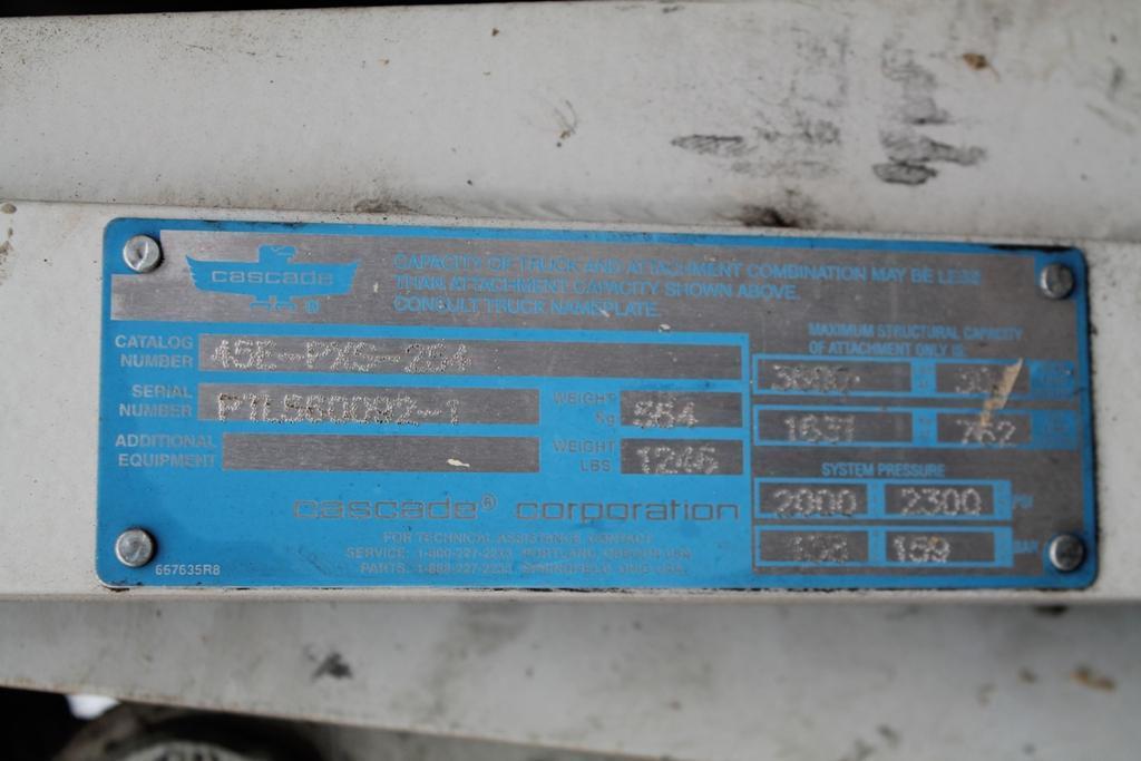 SERIAL .................... F187VO4490C MODEL ..................... S60FT YEAR NEW .................. 2005 CAPACITY .................. 4400 LBS LOAD CENTER ............... 30" LIFTING HEIGHT ............ 130" FUEL ...................... LP GAS MATERIAL PUSHER ........... CASCADE PUSHER MODEL .............. 45E-PXS-254 FRONT NON MARKING TIRES ... 21 "X 8" X 15" READ NON MARKING TIRES .... 16" X 6" X 10.5" FORKS ..................... YES TRANSMISSION .............. AUTOMATIC FINGER TIP CONTROLS ....... YES HOURS ................................................. 13200 |