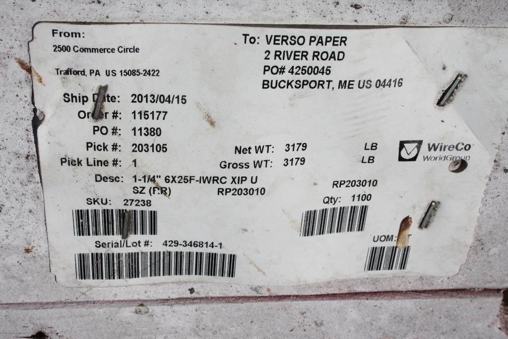 SERIAL/LOT ............ 429-346814-1 YEAR NEW .............. 4/15/2013 DIAMETER .............. 1-1/4" STRANDS ............... 6X25F-1WRC XIP U SIZE .................. RR LENGTH ................ 1100' |