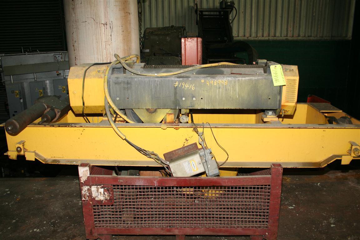 SERIAL ............................ R7634 CAPACITY .......................... 10 TONS HOISTING SPEED .................... 16 & 5 FPM WORKING HEIGHT MAX ................ 33' END TRUCK WHEEL CENTER DISTANCE ... 96" CABLE & C HOOK .................... YES LIFT ALL BAR CAPACITY ............. 5000 LB W/CENTER HOOK & 2 END HOOKS ....... YES LENGTH ............................ 10'6" MOTOR ............................. 10, 3.3 HP / 460/ 3 / 60 CONTROL VOLTAGE ................... 115 |