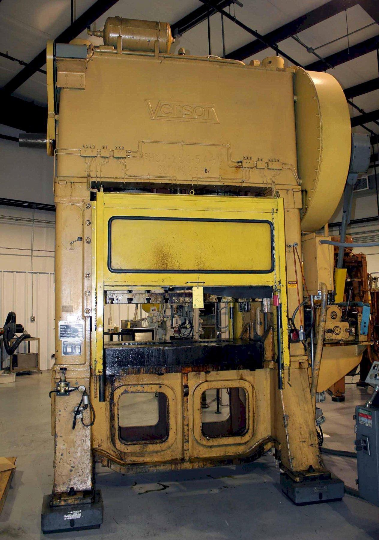 SERIAL ........................ 12634 MODEL ......................... HS2-250-54-30T CAPACITY ...................... 250 TON STROKE ........................ 4" SHUT HEIGHT ................... 18" SLIDE ADJUSTMENT .............. 3" STROKES PER MINUTE ........... 30 TO 60 (VARIABLE) AREA OF BED ................... 54" X 30" T-SLOTTED RAM BOLSTER ......... 3-1/2" WIDTH OF WINDOWS .............. 20" OPERATOR CONTROL STAND ........ YES AIR CLUTCH AND BRAKE .......... YES AIR COUNTER BALANCES .......... YES WINTRESS LOAD ANALYZER ........ YES FLOOR STANDING ................ YES FEEDER RUNNING OFF CRANK ...... YES |