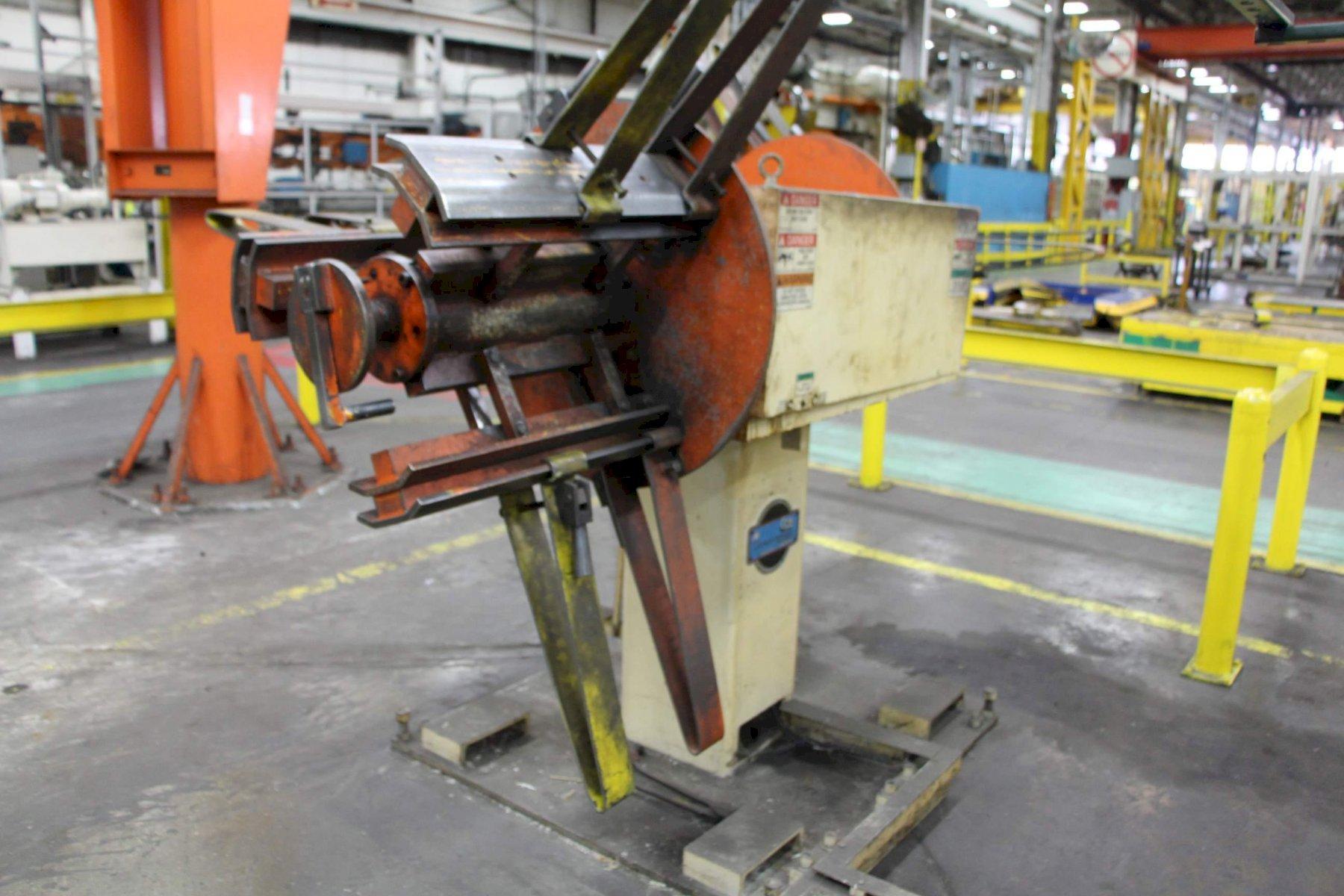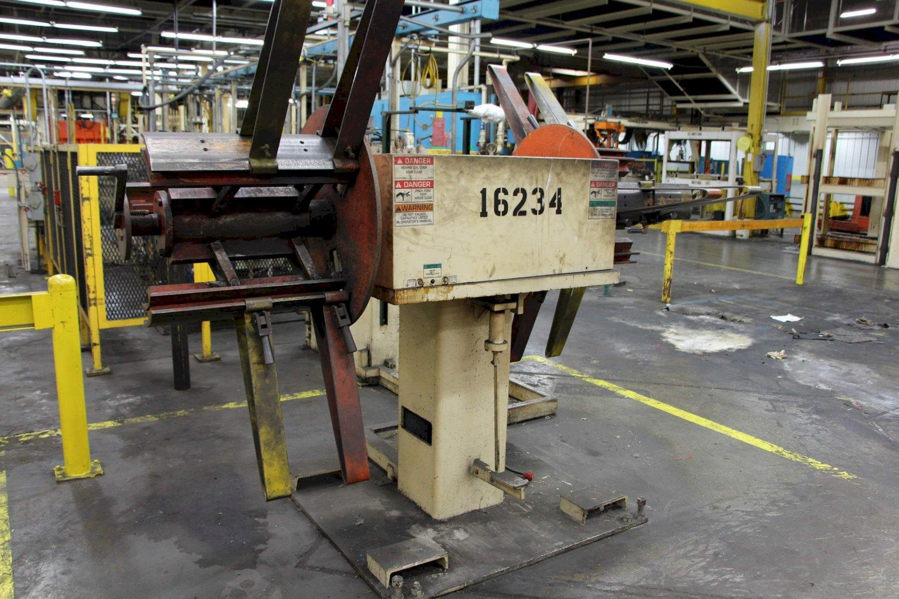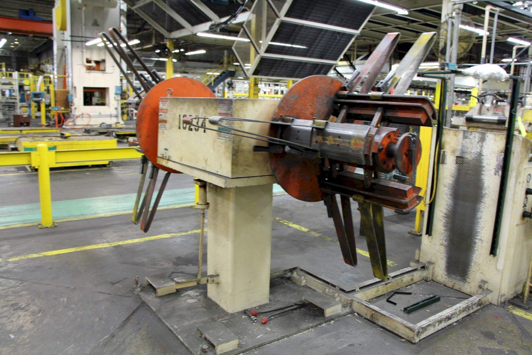 CONSISTS OF: 6000 LBS X 18" COE DOUBLE END COIL REEL SERIAL .......................... 24791-3 MODEL ........................... CPR-DE-PO-6018 YEAR NEW ........................ 2000 CAPACITY ........................ 10,000 LBS COIL WIDTH (MAX) ................ 18" COIL O.D. ....................... 60" COIL I.D ........................ 16" TO 21" SPECIAL COIL ADAPTER PADS I.D. .. 19" TO 24" BACKPLATE DIAMETER .............. 30" MANUAL EXPANSION ................ YES COIL KEEPERS .................... YES AIR DISC DRAG BRAKE ............. YES 12" X .080" COE MODEL CPPS-225-12 7 ROLL STRAIGHTENER SERIAL .......................... 24791-2 MODEL ........................... CPPS-225-12 YEAR NEW ........................ 2000 CAPACITY ........................ 0.020 TO 0.080 CAPACITY (MAX WIDTH) ............ 12" SPEED (MAX) ..................... 125 FPM NUMBER OF ROLLS ................. 7 (4 OVER 3) DIAMETER OF STRAIGHTENING ROLLS . 2-1/4" INDEPENTENT ROLL ADJUSTMENT ..... YES DIAMETER OF PINCH & EXIT ROLLS .. 3" ENTRY & EXIT PINCH ROLLS ........ YES PINCH ROLLS ADJUSTMENT .......... PNEUMATIC BRAKE ........................... PNEUMATIC DRAG ENTRY SLIDE & CLAMP EDGE GUIDES . YES REMOTE JOG PENDANT CONTROL ...... YES MOTOR ........................... 3 HORSEPOWER 12" X .080 COE MODEL CPRF-SM-1-12 COIL SERVO FEEDER MODEL ........................... CPRF SM-1 12 YEAR NEW ........................ 2000 CAPACITY (MAX WIDTH) ............ 12" CAPACITY ........................ .020 TO .080 SPEED (MAX) ..................... 295 FPM ACCELERATION .................... 100 F/S/S FEED ACCURACY ................... +/- .003" NUMBER OF FEED ROLLS ............ 2 DIAMETER OF ROLLS ............... 2-1/4" PASS LINE ....................... 39" ROLL PRESSURE (VARIABLE) ........ PNEUMATIC VERTICAL EDGE GUIDES ............ YES |