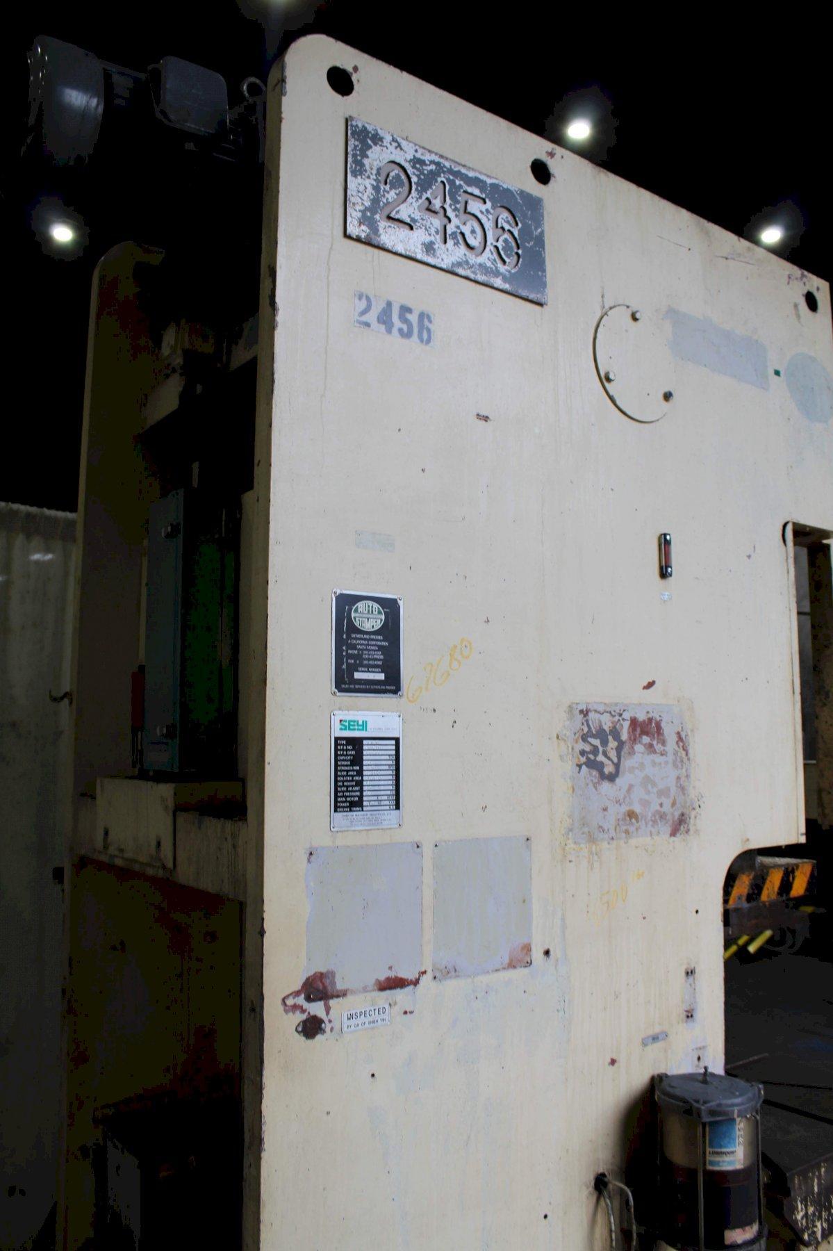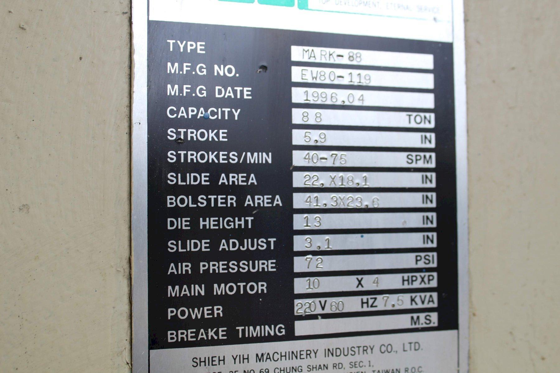 SERIAL ................... EW80-119 MODEL .................... SEYI MK88 CAPACITY ................. 88 TON YEAR ..................... 1992 STROKE ................... 5.9" SPM ...................... 40-75 DIE HEIGHT ............... 13" ADJUSTMENT ............... 3.1 AREA OF BED .............. 41.3" X 23.6" RAM ...................... 22" X 18.1" MOTOR .................... 440V / 3PH LIGHT CURTAINS SMART PACK 2 |