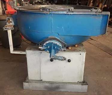Model: CD 400 Specification: Work bowl gross volume: 14.83 cu. ft. Usable volume: 8.83 cu. ft. Bowl diameter: 51" Through width: 15" Exit width: 13" with 1" diameter holes Largest workpiece dimension: 10" Screen area: 1,731 in2 Weight: 2,050 Lbs. Equipped with: Pneumatic separation flap (material removal ramp / long separation screen) Compound dosing pump Danfoss variable speed drive Large diameter media / fluid removal port |