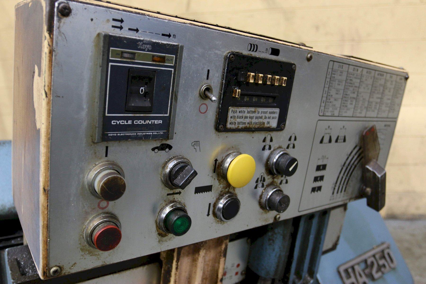 SERIAL ............................... 455182 MODEL ................................ HA-250 CAPACITY SQUARES ..................... 10" X 11" CAPACITY ROUNDS ...................... 10" CAPACITY RECTANGLES .................. 6-7/8" X 11.8" SPEEDS (VARIABLE) .................... 60,115 & 205 FPM WIDTH OF BLADE ....................... 1" LENGTH OF BLADE ...................... 138" HYDRAULIC BLADE DOWN FEED ............ YES PASS LINE HEIGHT ..................... 27" CHIP PAN ............................. YES AUTOMATIC SHUT OFF ................... YES MAIN MOTOR ........................... 5 HORSEPOWER |