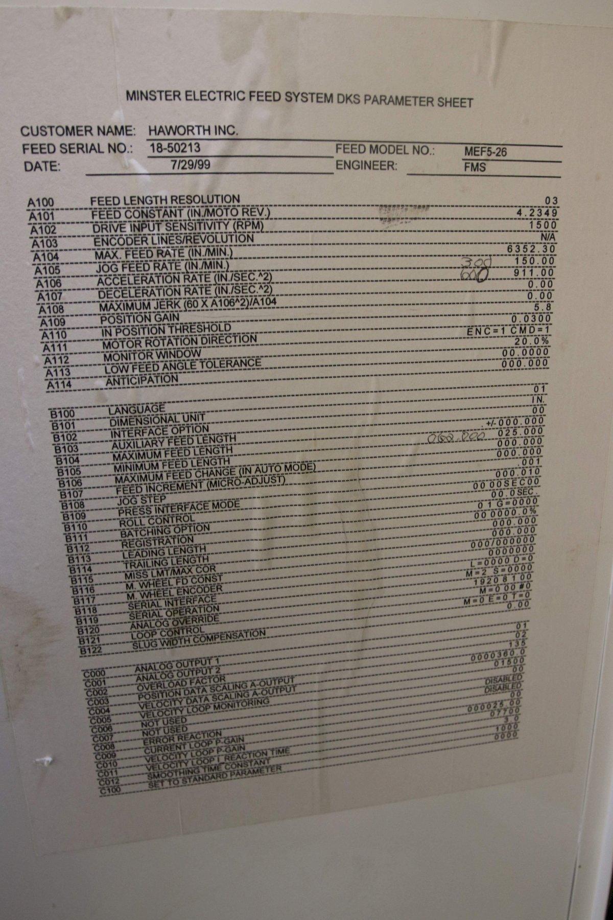 SERIAL .......................... 1851041 MODEL ........................... MEF3- 14S YEAR NEW ........................ 2001 WIDTH OF ROLLS .................. 14" DIAMETER OF ROLLS ............... 2-1/2" LOOP LOOP HEIGHT ................ 16" MIN TO 48" MAXIMUM FEED ANGLE ...................... 120 TO 240 DEGREE LOOP LENGTH ..................... 144 MAXIMUM FEED LENGTH ..................... 1" @ 120 DEGREE 231 SPM FEED LENGTH ..................... 4" @ 120 DEGREE 136 SPM FEED LENGTH ..................... 8" @ 120 DEGREE 99 SPM FEED LENGTH ,.................... 12" @ 120 DEGREE 78 SPM FEED LENGTH ..................... 18" @ 120 DEGREE 60 SPM PRESS MOUNT ..................... YES WEIGHT .......................... 1800 LBS CONTROL CABINET ................. INDRAMAT CONTROL SERVO MOTOR .................... 3.6 AMPS/ 480 VOLT |