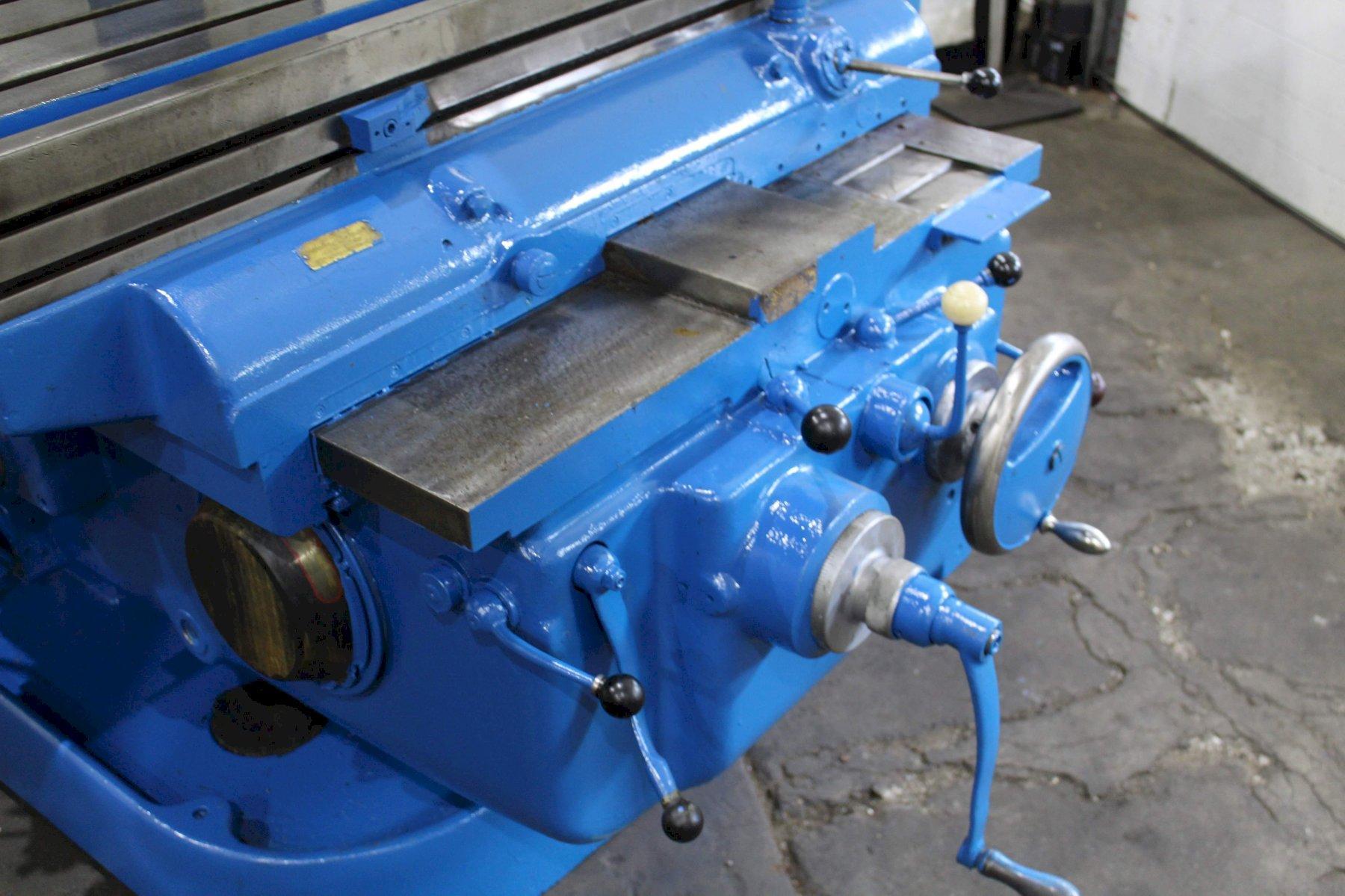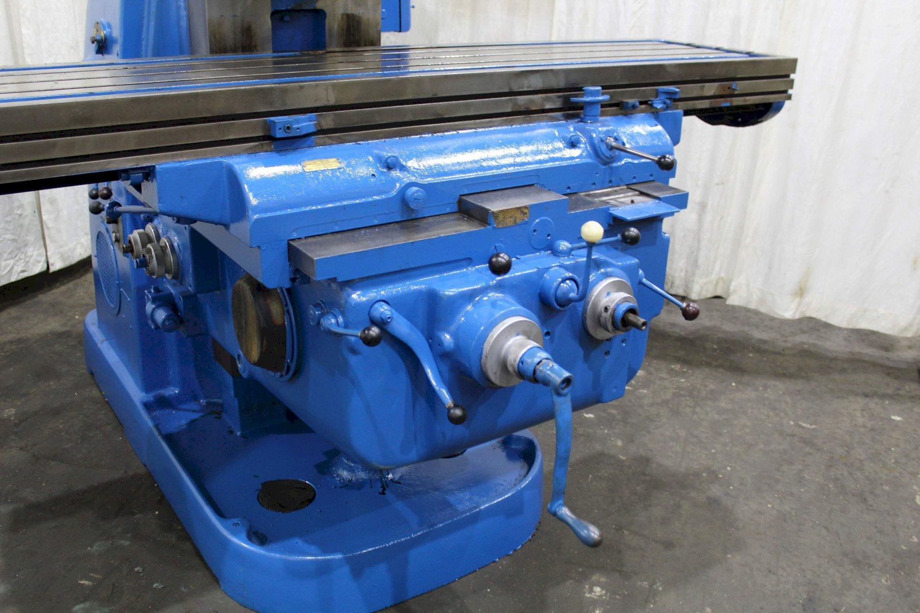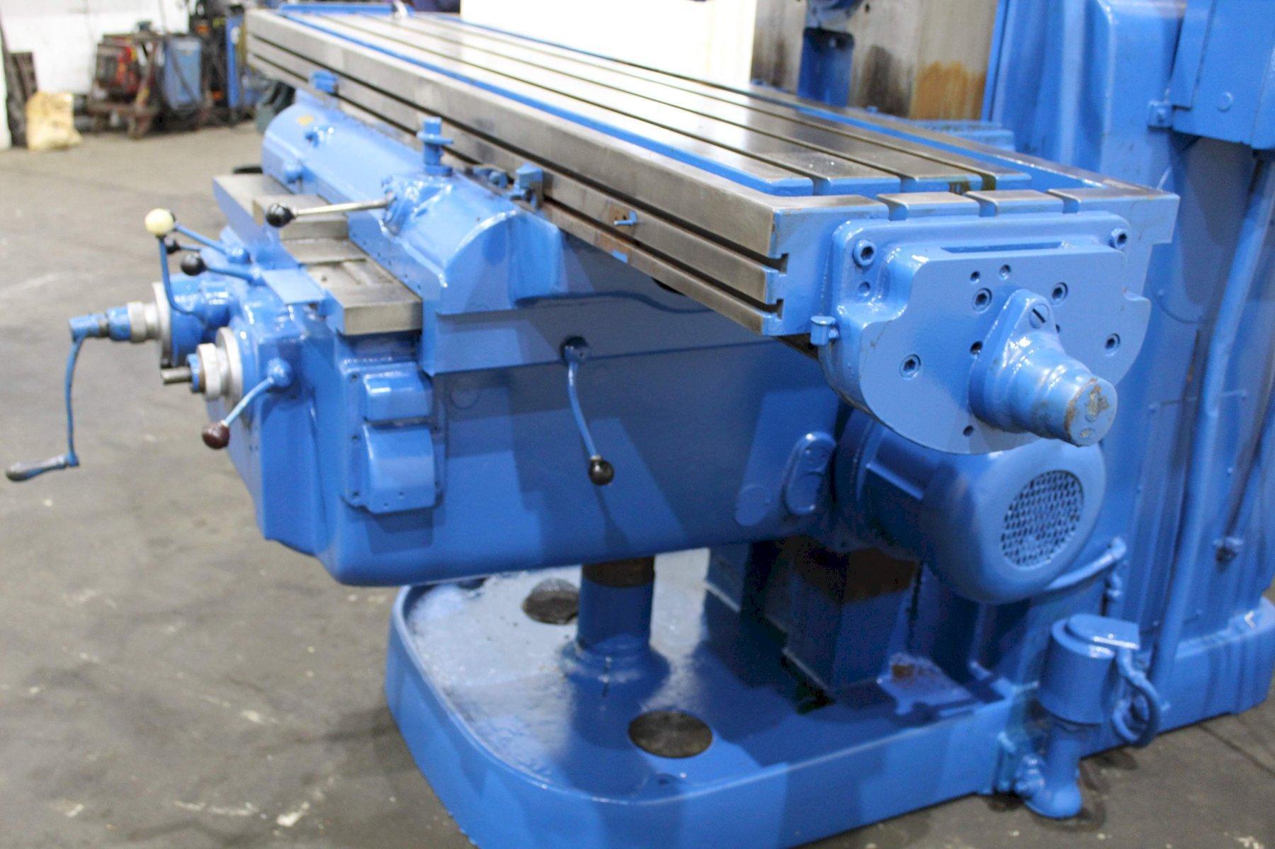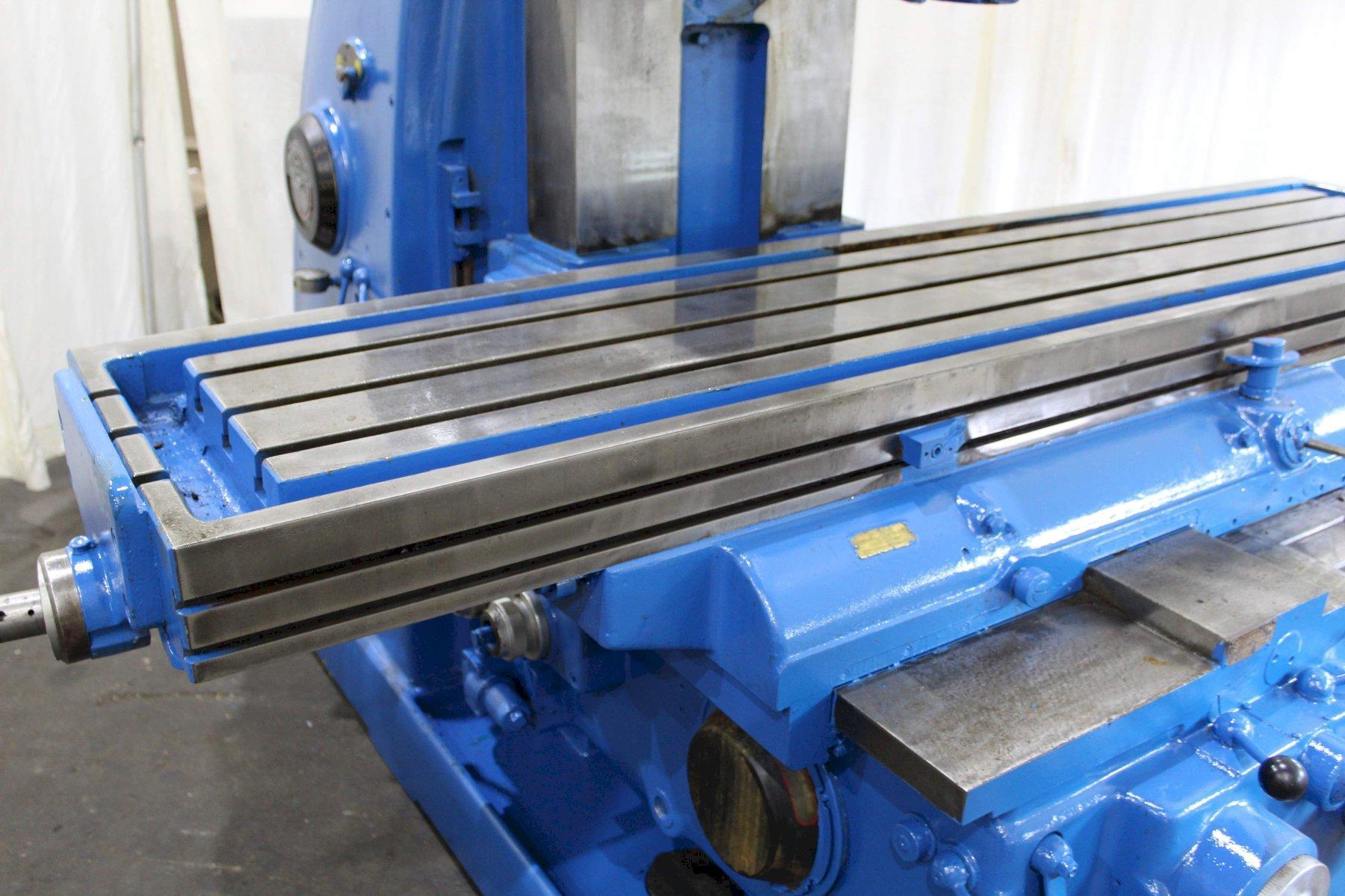 SERIAL ........................... 4J4P7C-7 MODEL ............................ 4 AREA OF TABLE .................... 86" X 20" SPINDLE SPEEDS ................... (24) 16 TO 1600 RPM LONGITUDINAL & CROSS FEEDS ....... (32) 1/4 TO 60 IPM VERTICAL FEEDS ................... (32) 1/16 TO 15 IPM LONGITUDINAL TRAVEL .............. 42" CROSS TRAVEL ..................... 14" VERTICAL KNEE TRAVEL ............. 20" CENTERLINE OF SPINDLE TO TABLE ... 0" MIN TO 20" MAX RAPID TRAVERSE ................... 150 IPM TAPER IN SPINDLE ................. #50NS DUAL CONTROL ..................... YES COOLANT .......................... YES MAIN MOTOR ....................... 30 HORSEPOWER |