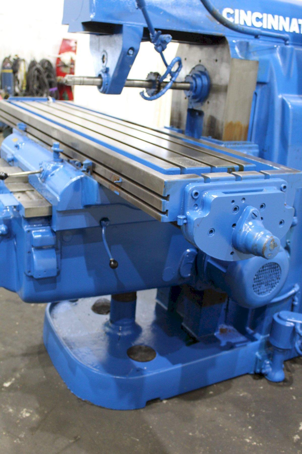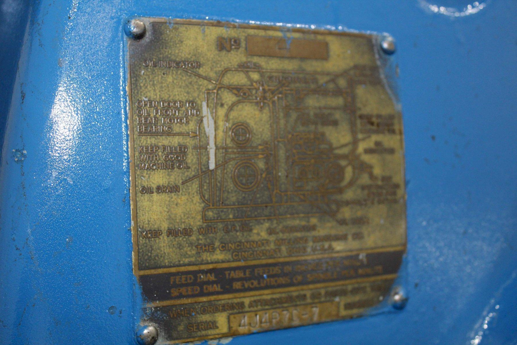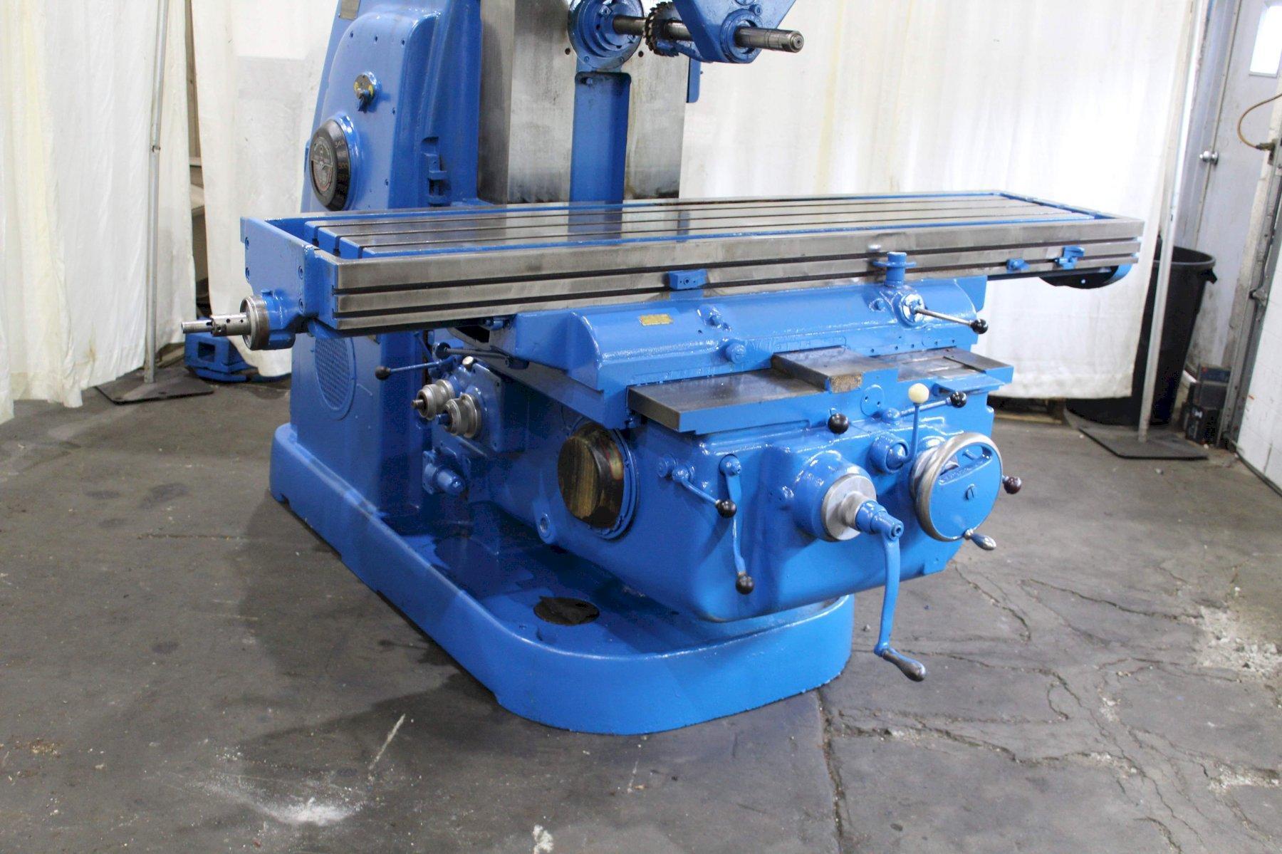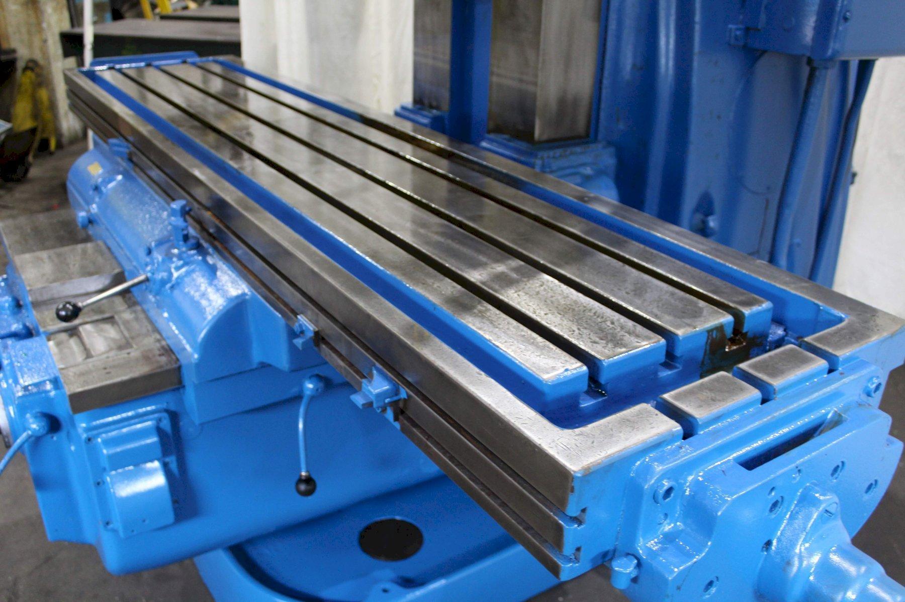 SERIAL ........................... 4J4P7C-7 MODEL ............................ 4 AREA OF TABLE .................... 86" X 20" SPINDLE SPEEDS ................... (24) 16 TO 1600 RPM LONGITUDINAL & CROSS FEEDS ....... (32) 1/4 TO 60 IPM VERTICAL FEEDS ................... (32) 1/16 TO 15 IPM LONGITUDINAL TRAVEL .............. 42" CROSS TRAVEL ..................... 14" VERTICAL KNEE TRAVEL ............. 20" CENTERLINE OF SPINDLE TO TABLE ... 0" MIN TO 20" MAX RAPID TRAVERSE ................... 150 IPM TAPER IN SPINDLE ................. #50NS DUAL CONTROL ..................... YES COOLANT .......................... YES MAIN MOTOR ....................... 30 HORSEPOWER |