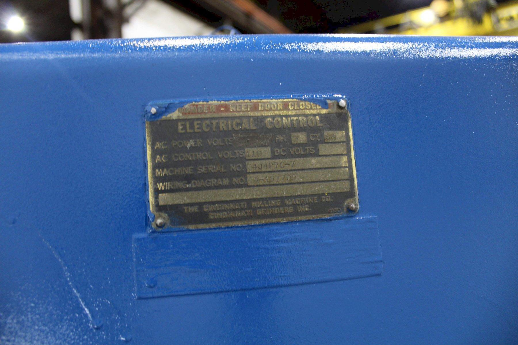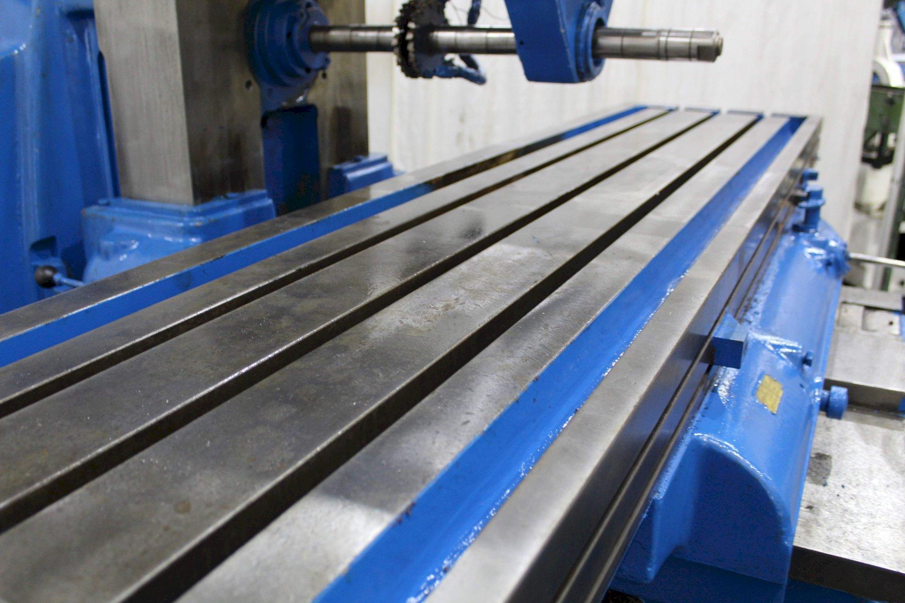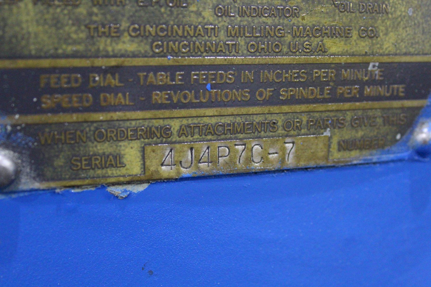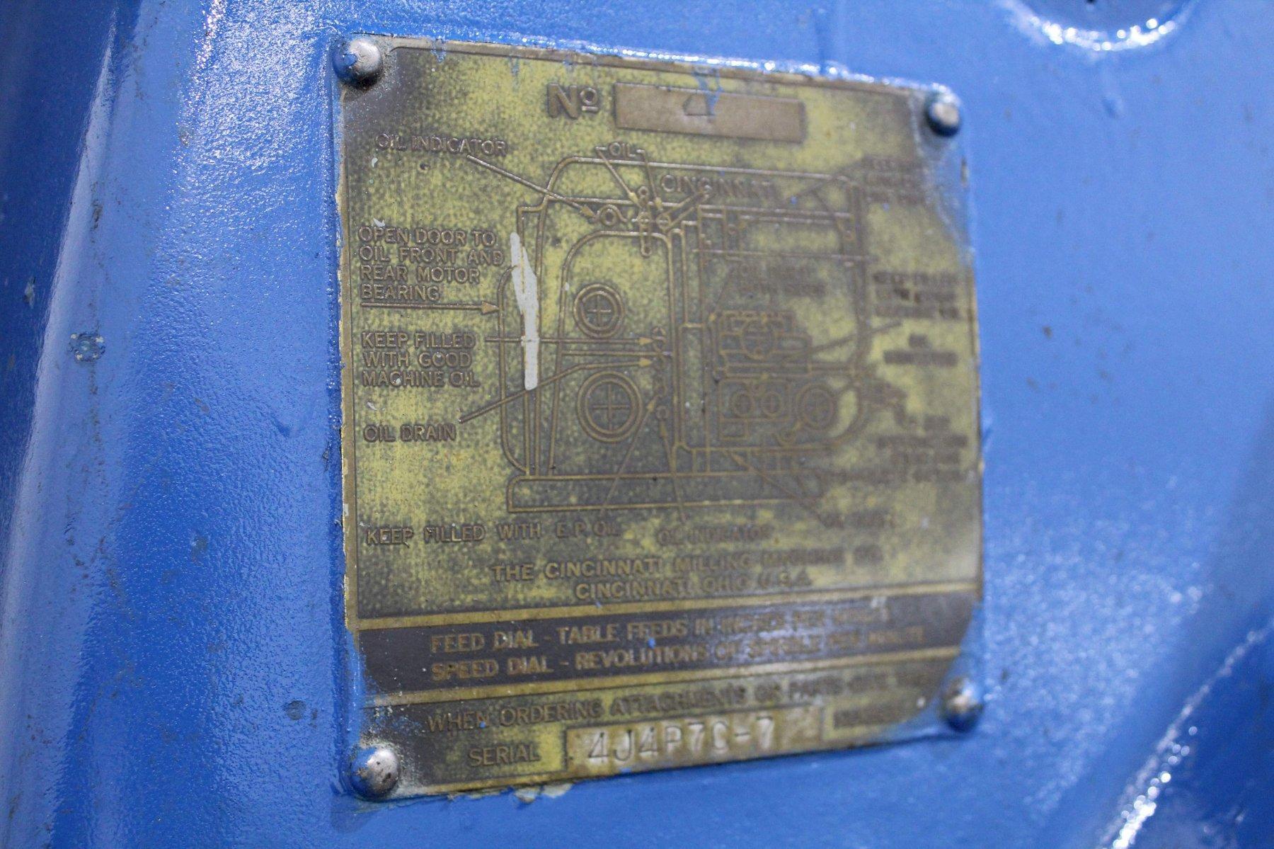 SERIAL ........................... 4J4P7C-7 MODEL ............................ 4 AREA OF TABLE .................... 86" X 20" SPINDLE SPEEDS ................... (24) 16 TO 1600 RPM LONGITUDINAL & CROSS FEEDS ....... (32) 1/4 TO 60 IPM VERTICAL FEEDS ................... (32) 1/16 TO 15 IPM LONGITUDINAL TRAVEL .............. 42" CROSS TRAVEL ..................... 14" VERTICAL KNEE TRAVEL ............. 20" CENTERLINE OF SPINDLE TO TABLE ... 0" MIN TO 20" MAX RAPID TRAVERSE ................... 150 IPM TAPER IN SPINDLE ................. #50NS DUAL CONTROL ..................... YES COOLANT .......................... YES MAIN MOTOR ....................... 30 HORSEPOWER |