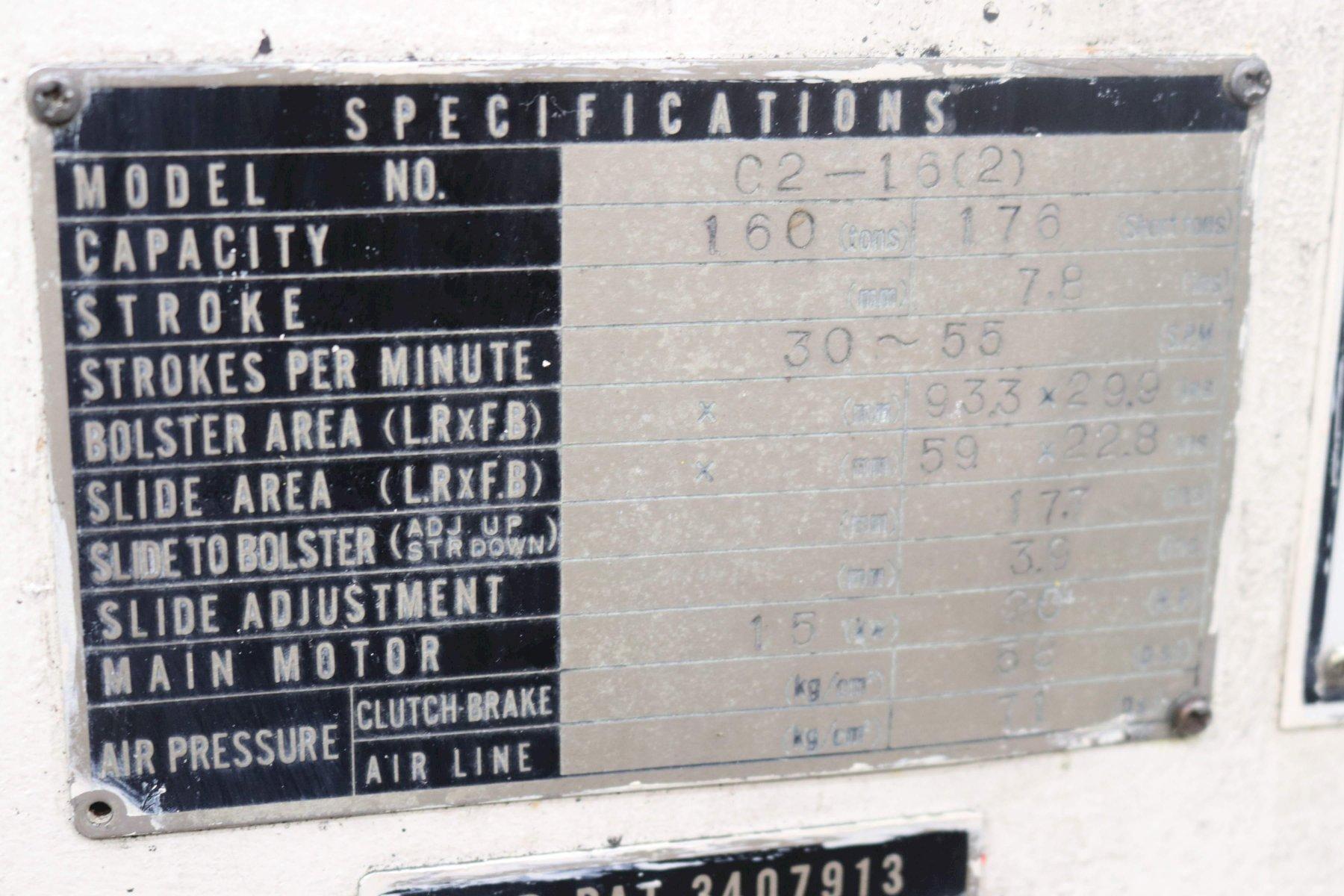 SERIAL ........................ 10516-0494 MODEL ......................... C2-16(2) YEAR NEW ...................... 2006 CAPACITY METRIC/SU ............ 160 METRIC 176 TON US AREA OF RAM ................... 59" X 22.8" AREA OF BED ................... 93.3" X 29.9 STROKE ........................ 7.87" SLIDE ADJUSTMENT (MOTORIZED) .. 3.93" SHUT HEIGHT OVER BOLSTER ...... 17.7" STROKES PER MINUTE ............ 30 TO 55 SPM AREA OF T SLOTTED BOLSTER ..... 93.3 X 29-3/4" X 4-3/4" DISTANCE BETWEEN HOUSINGS ..... 63" AIR CLUTCH .................... YES AIR BRAKE ..................... YES AUTOMATIC LUBE ................ YES INCH, SINGLE & CONTINUOUS ...... YES DUAL PALM BUTTONS ............. YES FLOOR TO TOP OF BOLSTER ....... 38-1/2" CONTROLS ....................... CIECP PLUS MAIN MOTOR .................... 20 HORSEPOWER |