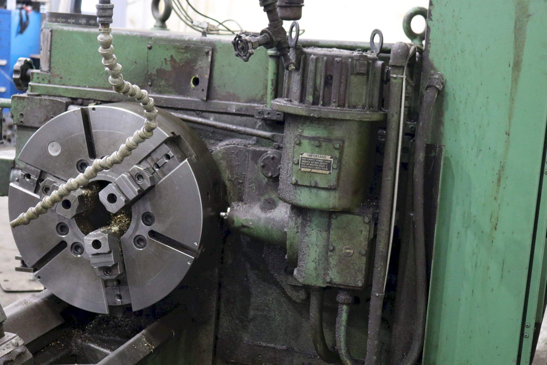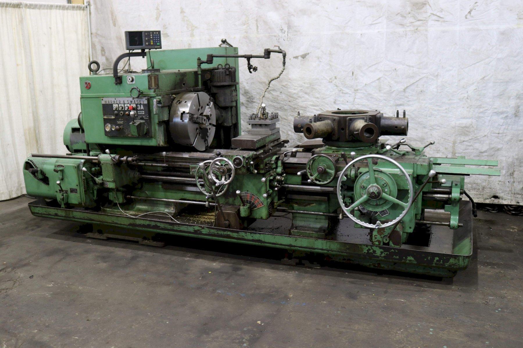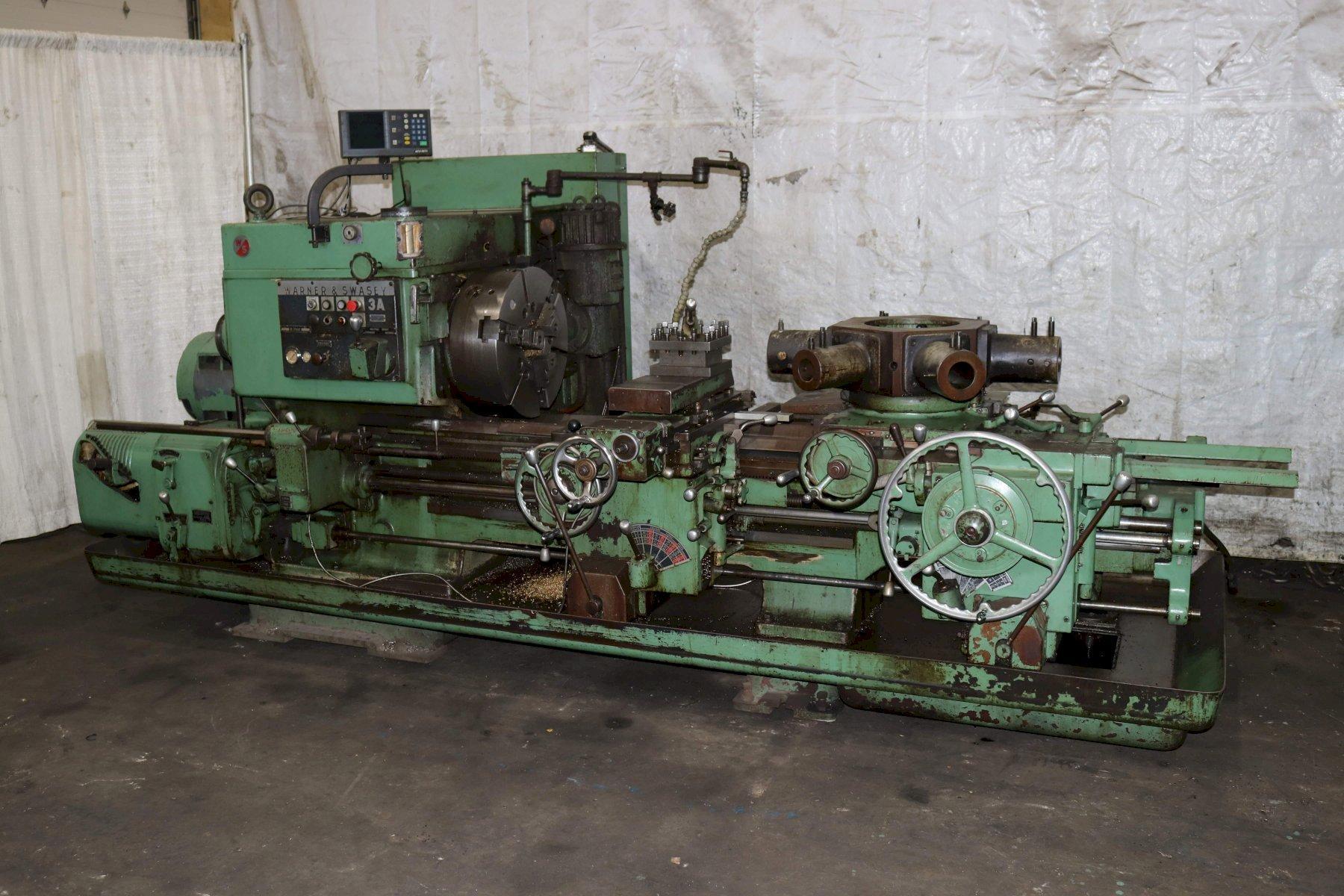 SERIAL ................................. 2796737 MODEL .................................. 3A (M-3500) SQUARE HEAD SWING OVER BED ......................... 24-1/2" SWING OVER CARRIAGE HORN ............... 18" SPINDLE NOSE TO TURRET ................. 58-3/4" SPINDLE HOLE ........................... 6-1/8" SPINDLE SPEEDS ......................... (32) 18 TO 639 RPM CHUCK WITH POWER WRENCH ................ 21" 3 JAW CARRIAGE LONGITUDINAL FEEDS ............ (16) .0029 TO .187 IPR CARRIAGE CROSS FEEDS ................... (16) .002 TO .082 IPR TURRET LONGITUDINAL FEEDS .............. (16) .005 TO .167 IPR TURRET CROSS FEEDS ..................... (16) .003 TO .096 IPR TAPER ATTACHMENT ON CROSS SLIDE ........ YES TAPER ATTACHMENT ON TURRET .............. YES **CROSS SLIDING TURRET** ............... YES ** COMPOUND CROSS SLIDE ** ............. POWERED FULL LENGTH THREADING .................. YES 3 AXIS DIGITAL READOUTS ................ ACCURITE CHIP PAN WITH COOLANT .................. YES MAIN MOTOR ............................. 40 HORSEPOWER |