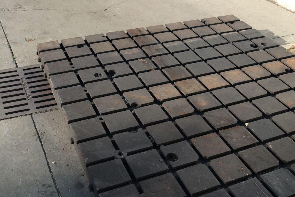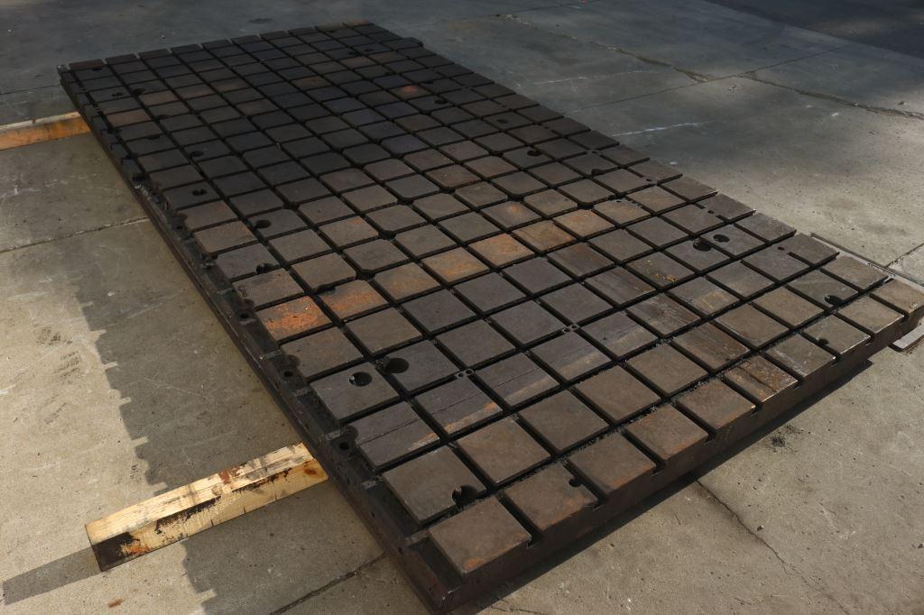 LENGTH OF PLATE .............. 144" WIDTH OF PLATE ............... 73" THICKNESS OF PLATE ........... 4" CONSTRUCTION ................. SOLID STEEL T SLOTS 144" DIRECTION ....... 10 T SLOTS 73" DIRECTION ........ 20 T SLOT CENTERS ............... 7" T SLOT DIMENSIONS AT TOP ..... 3/4" T SLOT DEPTH ................. 1-3/8" T SLOT WIDTH AT BOTTOM ....... 2" LEVELING HOLES ............... YES |