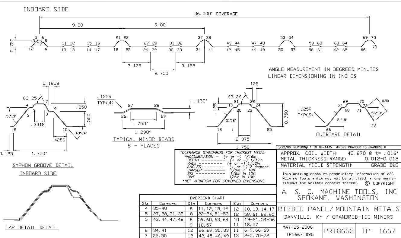SERIAL / JOB # 16661.000 MODEL ................ CA S4-44-14/14 SERIES ............... SELECT ROLLFORMER TOP TOOLED FOR ....... "R" PANEL BOTTOM TOOLED FOR ... "AG" PANEL W/ 9" CENTERS NUMBER OF PASSES ..... 14 ARBOR SIZE ........... 3" FRONT END DESIGN ..... BRAKE & HUMP CONTROLS ............. YES Dual profile machines are often referred to as dual-height or double-deck machines because there is a lower set of stands and tooling for one profile, and a higher set of stands and tooling for the second profile. Both levels sit on a common base. Material feeds in and exits from either the higher or lower level. If floor space is limited, adding a second deck to your existing roll former is a good option. Running two profiles on only one machine will also save on manpower and the additional cost for a second set of ancillary items (electrical setups, controllers, uncoilers, shears, etc.) needed for a new line. While a space-saver, you can only operate on one level at a time. The following are the most common profiles on dual profile panel lines: |
