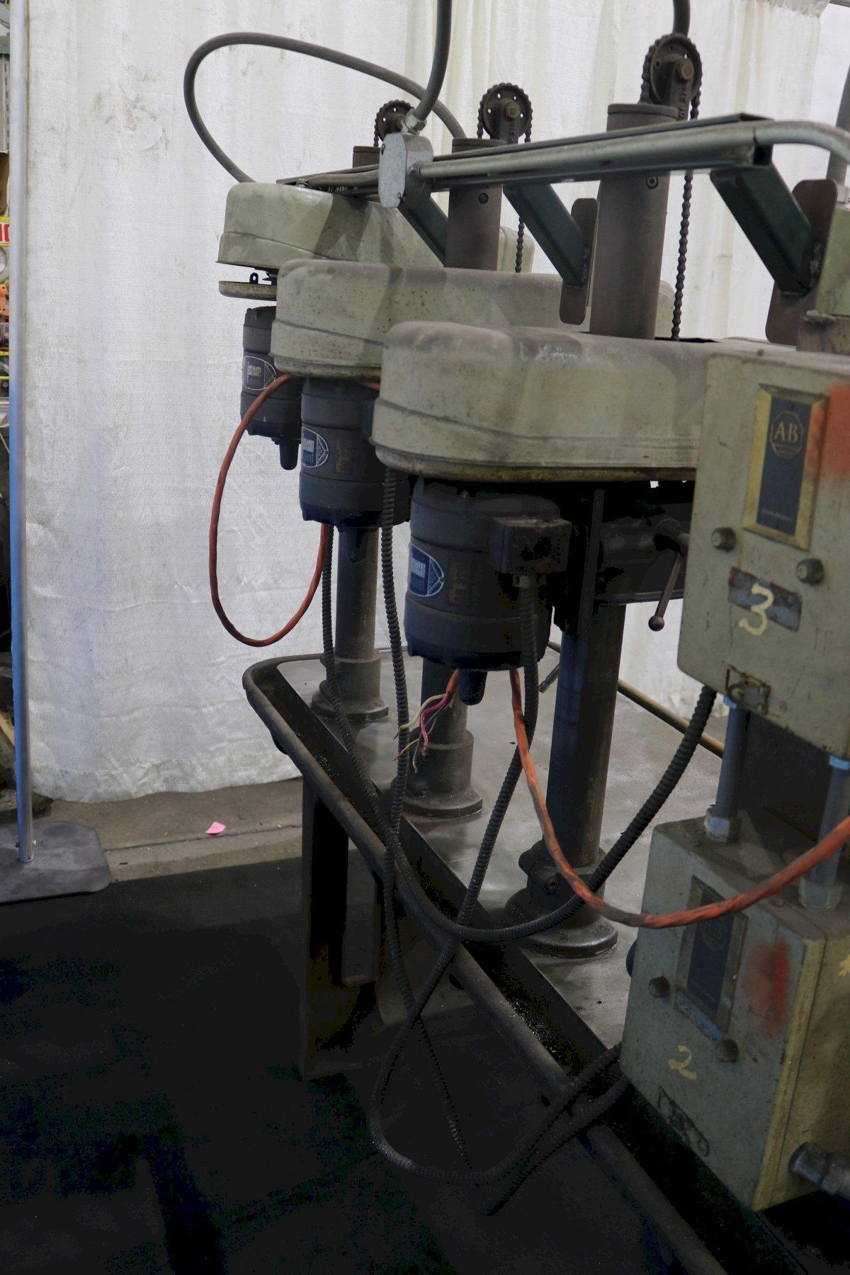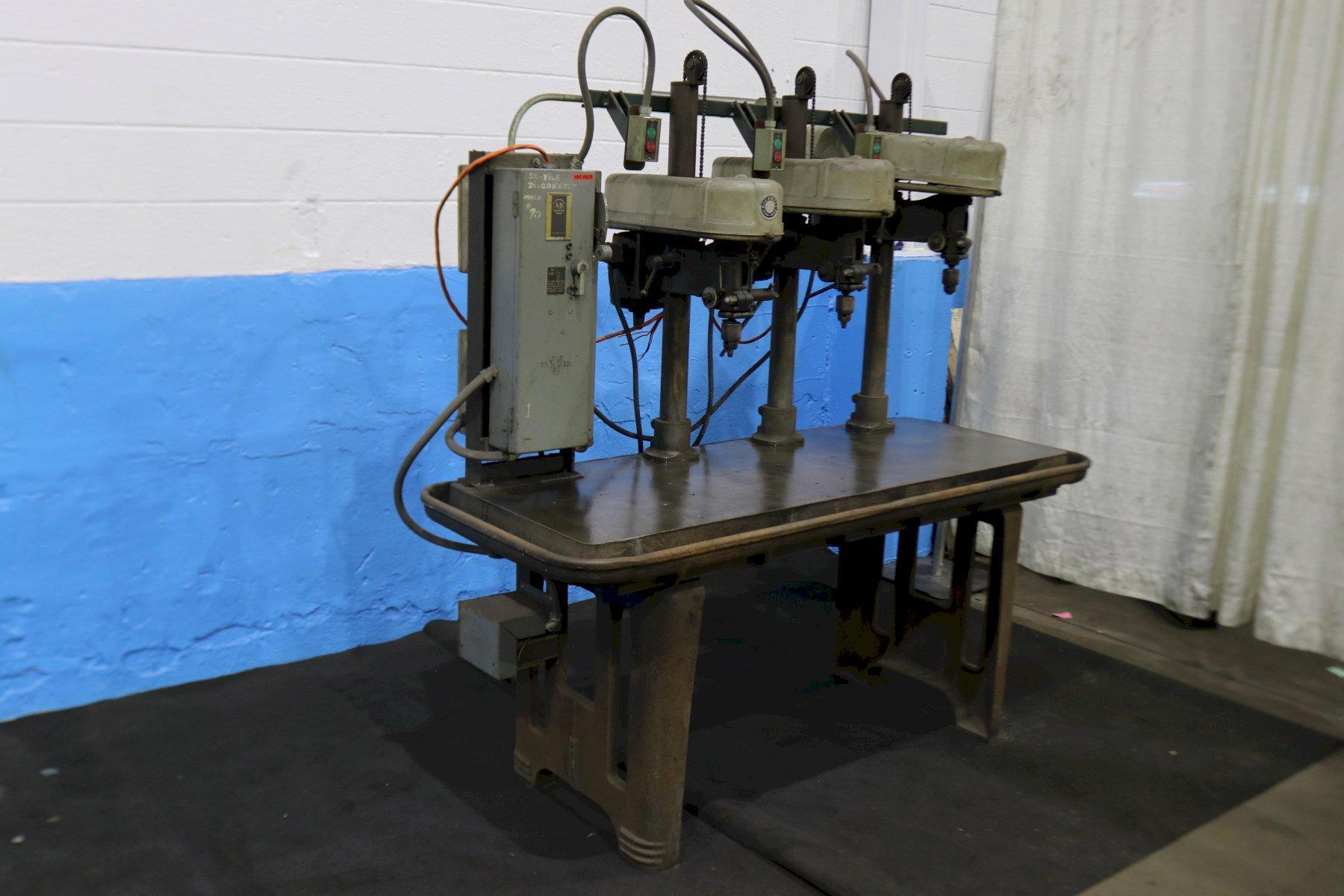 NUMBER OF DRILL HEADS ............ 3 AREA OF TABLE .................... 72" X 29" WORKING SURFACE OF TABLE ......... 65" X 23" DISTANCE BETWEEN SPINDLES ........ 16" SPINDLE SPEEDS ................... 425 TO 5500 RPM SPINDLE STROKE ................... 4" DEPTH OF THROAT .................. 7" DISTANCE SPINDLE TO TABLE ........ 0" TO 20" MAXIMUM SPINDLE CAPACITY ................. 1/2" MAXIMUM PASSLINE HEIGHT .................. 33' MOTOR HORSEPOWER .................(3) @ 1/2 |