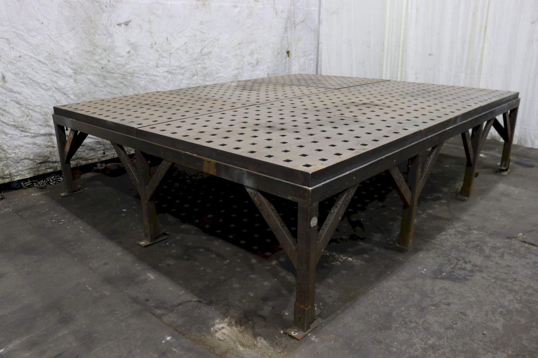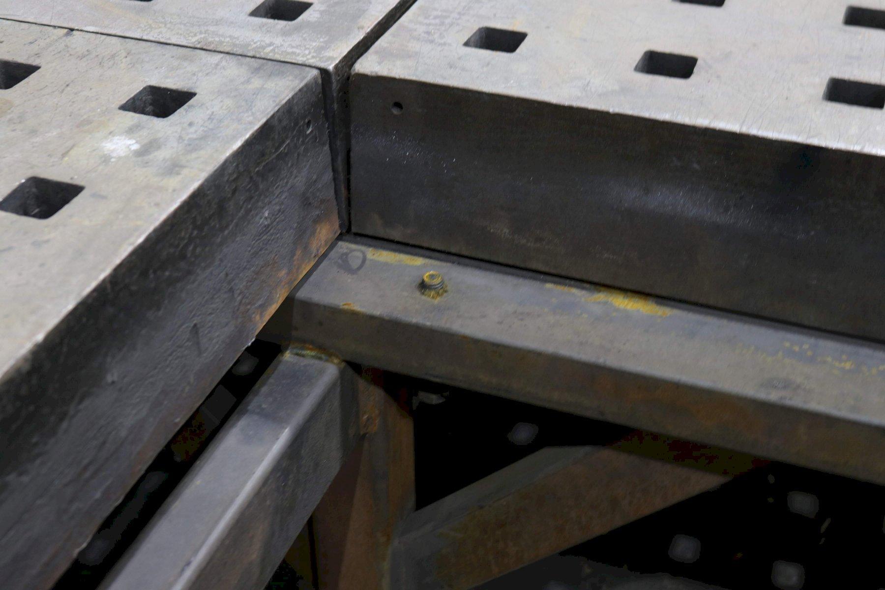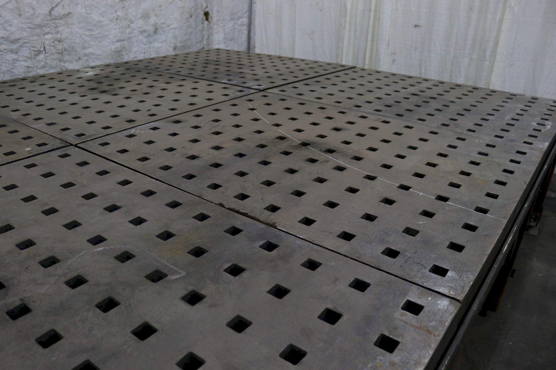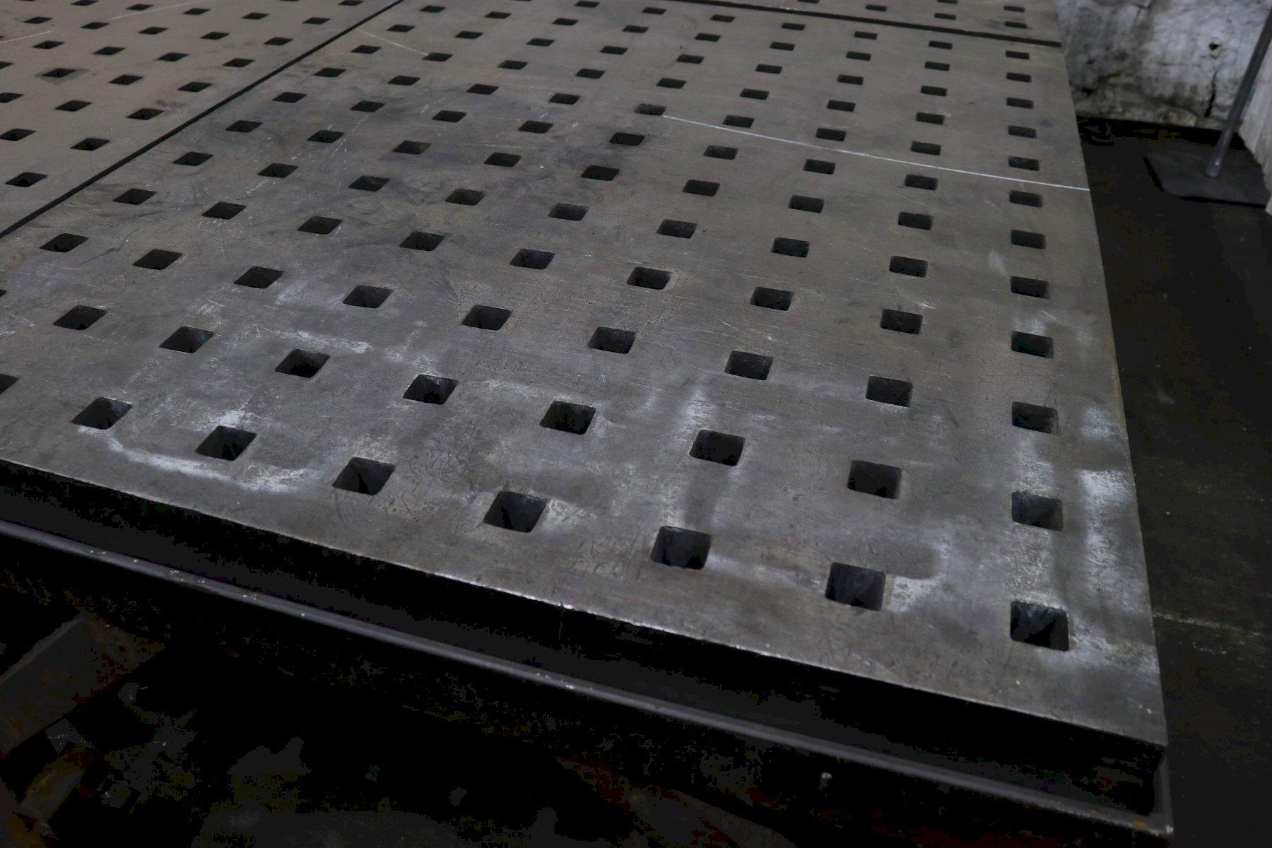 NUMBER OF PLATES ............. 6 PLATE LENGTH ................. 60" PLATE WIDTH .................. 48" PLATE THICKNESS .............. 5-3/8" TOTAL LENGTH ................. 12' TOTAL WIDTH .................. 10' HOLE SIZE .................... 1-1/2" X 1-1/2" NUMBER OF SQAURE HOLE ........ 96 PER PLATE HEIGHT ON STAND .............. 33" LEVLEING SCREW ............... YES |