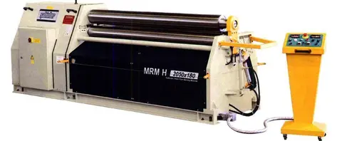 MRM-S Plate Bending Rolls are initial-pinch type, easy to operate and low cost. The frames are amply-sized steel plate weldments to assure rigidity and stability. The upper and lower front rolls are driven by brake-motor through heavily proportioned gears. The brake-motor provides rapid stopping of the roll's rotation. To clamp the plate, the lower roll is easily adjusted from a single position; the operator does not have to make an adjustment at both ends of the machine. A locking device keeps the upper front roll in proper position during rolling, and when released, allows the roll to be swung out for removal of the finished cylinders. The rear roll is power-adjusted, using a separate motor and drive system built into the base of the machine. A cone bending attachment is standard equipment, and the rear roll can be tilted to facilitate the cone rolling procedure. The shafts of all three rolls are extended beyond the right-side frame of the machine for optional bar/angle rolls. A movable foot control for forward and reverse allows the operator to position himself for convenience and ease of operation. Emergency-stop wires are mounted at the front and rear of the machine and an emergency-stop palm button is also provided.