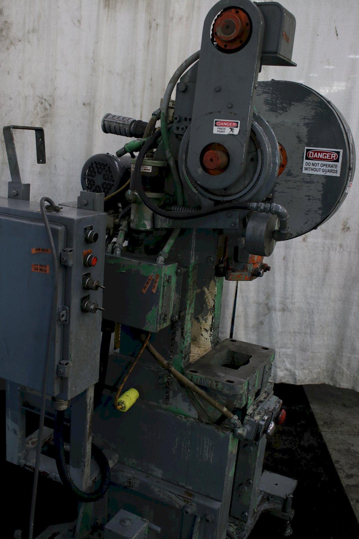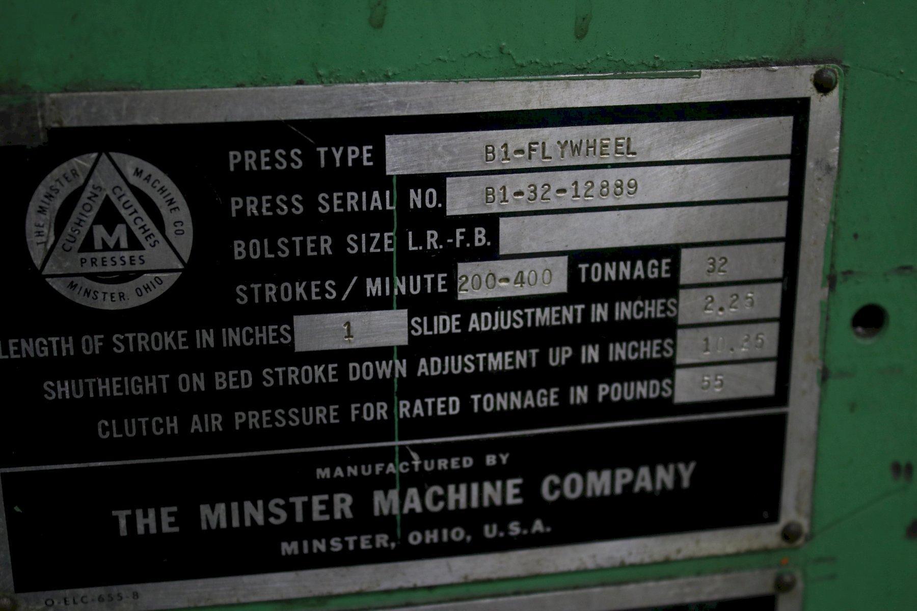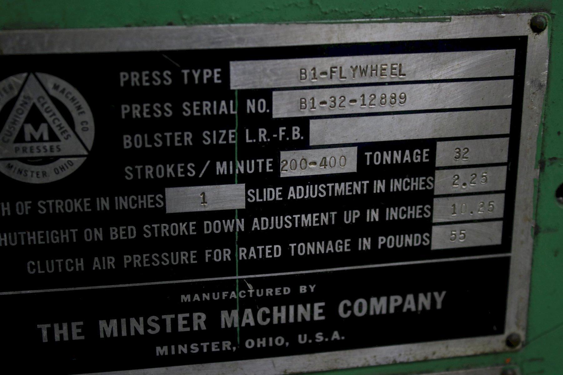 SERIAL ................ B1-32-12889 MODEL ................. B1-32 CAPACITY .............. 32 TON STROKE ................ 1" STROKES PER MINUTE .... 200 TO 400 SPM SHUT HEIGHT (SDAU) .... 10-1/4" RAM ADJUSTMENT ........ 2-1/4" AREA OF BED ........... 24" X 15" DUAL PALM BUTTONS ..... YES AUTOMATIC LUBE ........ YES AIR CLUCTH ............ YES AIR BRAKE ............. YES BOLSTER PLATE ......... T SLOTTED MOTOR ................. 5 HORSEPOWER |
