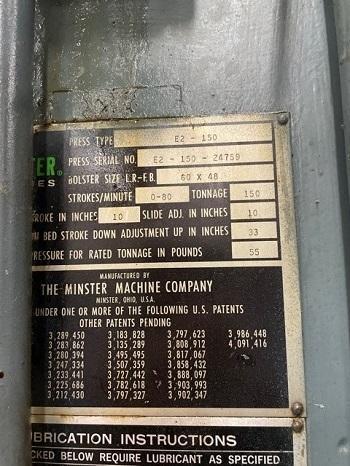 MODEL: E2-150-60 Serial Number - 24759 YEAR: 1981 Capacity: 150 Ton Stroke: 10" Shut Height: 33" Slide Adjustment: 10" Speed: 0-80 SPM Bed Area: 60" L-R x 48" F-B Equipped With: Wintriss SmartPac 2 Air Clutch & Brake Air Counterbalances Free Standing Control Console Dallas DRFES-306-LH Feeder / Dallas PTS-219-LH Pull Thru Straightener Year: 2014 6" x .023" - .090" MCRS / 3" x .105" MCRS 0-99.999" Feed Lengths 3" Diameter Feed Rolls (7) Roll Pull Thru Straightener Cabinet Style Dallas DPR-4000#x12-LH Coil Reel Year: 2014 Coil Capacity: 4,000 Lbs Coil Width: 12" Coil ID: 18" - 22" Coil OD: 72" 3 Leaf Style / Coil Keepers Manual Expansion |