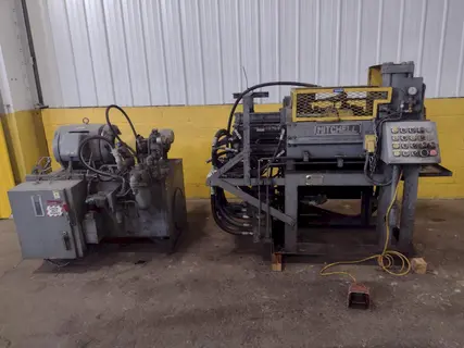 RATED TUBE SIZES: #1, 2 & 3 .................................. 29,500 LBS @ 3000 PSI $4 ......................................... 24,900 LBS @ 3000 PSI POINTING DIES: #1, 2 & 3 .................................. 5" OD (SPECIAL FLANGED) CARBIDE INSERT DIES: #4 ......................................... 3-1/2" OD CARBIDE NUMBER OF POINT LENGTHS .................... INFINITE BY ADJUSTABLE LIMIT SWITCH: MAX TRAVEL OF DIES ......................... 12" POINTING SPEEDS: ADVANCE #1 DIE TO POINT LENGTH ............. 60 IPM @1000 PSI ADVANCE #1, 2, & 3 DIES .................... 349 IPM @ 2500 PSI RETRACT #1, 2 & 3 DIES ..................... 534 IPM @ 1000 PSI ADVANCE #4 DIE ............................. 328 IPM @ 2500 PSI RETRACT #4 DIE ............................. 442 IPM @ 1000 PSI AUTOMATIC CYCLE ............................ 1, 2, 3 OR 4 PUSH TUBE GRIPPER JAWS: MAX OD (SINGLE SIDED FIXED) ................ 1-3/4" MAX OD LENGTH OF GRIPPER JAWS ..................... 10" MAX OPENING BETWEEN GRIPPER JAWS ........... 1-3/4" CLAMPING MECHANISM ......................... DIRECT ACTING HYDRAULIC CYLINDER: HYDRAULIC RESERVOIR ........................ 100 GALLONS HYDRAULIC FLUID (PETROLEUM OIL) ............ 150-315 SUS @100E F HYDRAULIC CYLINDERS: #1, 2 & 3 DIE CROSSHEADS ................... (6) 2-1/2" BORE X 1-3/8" ROD #4 DIE HOLDER .............................. (1) @ 3-1/4" BOR X 1-3/8" ROD CLAMPING ................................... (1) @ 6" BORE X 3-1/2" ROD HYDRAULIC PUMP ............................. DOUBLE VANE PUMP 14.8 GPM @2500 PSI 11.8 GPM @ 2500 PSI METHOD OF LUBING DIES ...................... LINCOLN LUBE EJECTORS: HYDRAULIC PUMP DRIVE MOTOR ................. 30HP/1200RPM/3PH/6HZ/TEFC/FR #326TC HYDRAULIC PUMP DRIVE MOTOR STARTER SIZE 3 .. FULL VOLTAGE COMBINATION W/FUSED DISCONNECT IN NEMA 12 ENCLOSURE PROGRAMMABLE ELECTRICAL CONTROL ............ YES MAIN POWER SUPPLY .......................... 460V/3PH/60HZ CONTROL CIRCUIT ............................ 120V/SINGLE PHASE SPECIAL TUNGSTEN CARBIDE FLANGED DIES FURNISHED FOR 1-1/4" DIA TUBES: (1) - 1.050" |