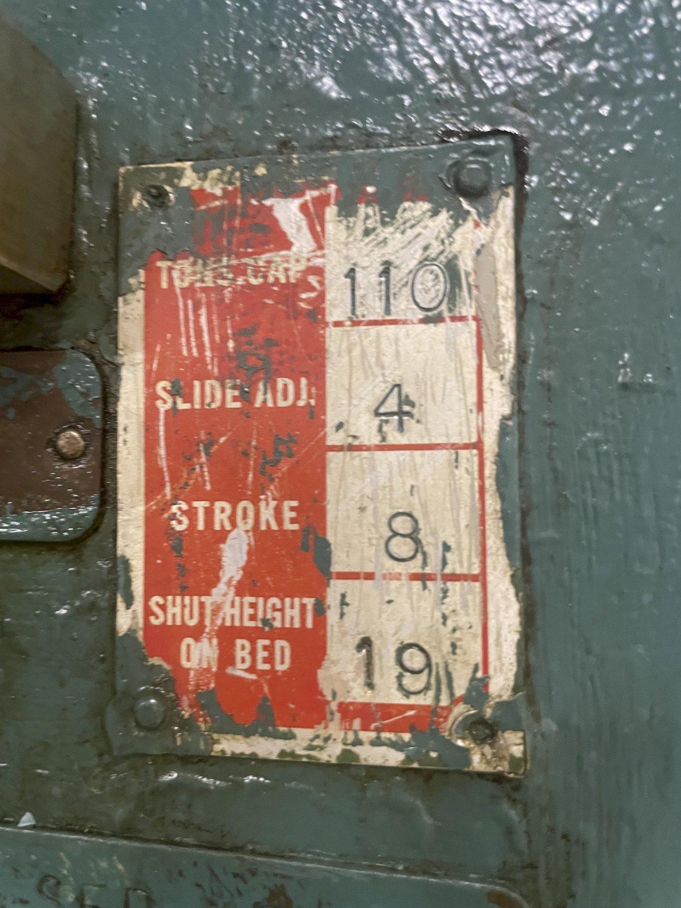 MODEL .................. C-110 CAPACITY ............... 110 TON STROKE ................. 8" SLIDE ADJUSTMENT ....... 4" SHUT HEIGHT ............ 18" THROAT ................. 15-1/2" SPEED .................. 40 SPM BED AREA ............... 42" L-R X 27" F-B BOLSTER PLATE .......... 42" X 28" X 3-1/2" THICK RAM AREA ............... 21" L-R X 28" F-B RAM & BED T-SLOTTED .... YES AIR CLUTCH ............. YES AIR BED CUSHION ........ YES AIR COUNTER BALANCE .... YES AUTOMATIC LUBE SYSTEM .. YES OPERATOR'S PEDISTAL .... YES PALM BUTTON CONTROLS ... YES LIGHT CURTAINS ......... YES MOTOR .................. 10 HP |