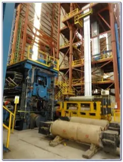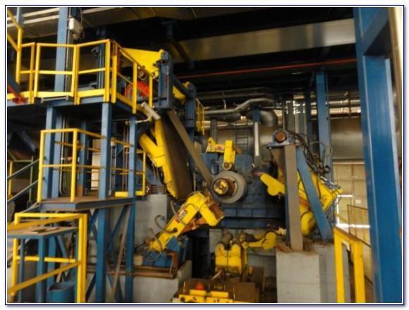 Production Start up- February, 2002 LINE SPECIFICATIONS Entry Material: Cold Rolled Steel Full Hard: 0.4mm to 3.0mm MATERIAL PRODUCED Thickness, Width and Speed: Galvanized Coils- 3000mm2 Thickness: 0.3mm to 3mm Strip Width: 600mm to 1500mm Speed: 150m/Min Pre-Painted Coils from Cold Rolled Steel Coil: 2295mm2 Thickness: 0.3mm to 1.5mm Strip Width: 600mm to 1500mm Speed: 100m/Min PRODUCTION CAPACITY: 812 Tons Daily 50% Galvanized Coils and 50% of Pre-Painted Coils. Annual Nominal Production: 200,000 Tons Galvanized 150,000 Tons Galvanized and Pre-Painted Zinc Coating:40 G/M2 to 200 G/M2 per Side = 80 G/M2 to 400 G/M2 Zinc Pot Composition:Aluminum: 0.18 to 0.20%; Lead: 0.05% (Disappears) Production process is fully automated, controlled by operators from four control desks. Modern and sophisticated video systems, measurement and control. ENTRY Coil Storage Stands and Transfer System (2) Cars, Snubber Rolls, Coil Opening Peelers, Hydraulic Operation (2) Mandrel Type Uncoilers (2) 5-Roll Straighteners (2) FIFE Centering Systems (2) X-Ray Thickness Gauge System Crop Shear, Dump Station NEWCOR Splicer Welder NEWCOR Edge Welders BRIDLE ROLLS HORIZONTAL ACCUMULATOR GALVANIZING DEGREASING SECTION Pressurized Water Caustic Prewash and Brushes HEAT TREATMENT Continuous Annealing Furnace, 24 Direct Burners ZINC POT COOLING Fans and De-Mineralized Water Tank 45 Meter Cooling Tower 4 HI TEMPER MILL WITH TENSION LEVELING TEMPER MILL Hydraulic Bottom Screw Adjustment BRIDLE ROLLS TENSION LEVELING 6 Cassets BRIDLE ROLLS, DIRECTIONAL IF NO PAINT TO BE APPLIED Trivalent Chromium Protects Against Formation of Zinc Oxide IF PAINT IS TO BE APPLIED Chemical Treatment "Bonderized" to Improve Adhesive Properties of The Paint COIL COATING Primer Coat GLOBUS "S" Type Double Coil Coater, 2001A DRYING OVEN COIL COATING Finishing Coat, Color, Globus "T" Type Coil Coater Finishing Coat, for quick color change, One or Both Sides GLOBUS "S" Type Coil Coater DRYING OVEN Solvents Are Evaporated VERTICAL ACCULULATOR ELECTROSTATIC OILER RECOILER, MANDREL TYPE Coil Car BANDING STATION EXIT COIL STANDS |