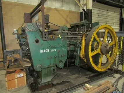Header, Serial No 4852 3/4" Max. wire diameter 18" Max. part length (Can be up to 32" with slight change) 3-1/2" Square Grip dies x 7" long. Approx. 25 PPM. Equipped with Magazine feeder Motorized chain escapement conveyor Extended gather and pull-off (approx. 3-1/2") Gear drive A/C motor and controls. This machine was originally a coil fed machine. Dimensions: 14'6" L x 9'11" W x 9' H - sitting on 9' x 9' x 1" think plate. Plate possible weight of 4-5000 lbs of the 80,000 lbs estimate Weight: Approx. 80,000 lbs. |