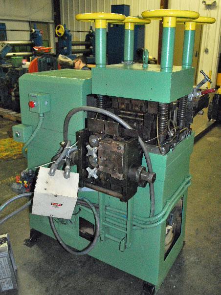 TYPE: 19 ROLL BACKED UP LEVELER MODEL No.: 24180B SERIAL No.: 55033 YEAR OF MANUFACTURE: 1982 TYPICAL THICKNESS RANGE: 0.0157" - 0.098" (0.4mm - 2.5mm) MAX STRIP WIDTH: 7" (180mm) No. OF ROLLS: 19 No. OF DRIVEN ROLLS: 19 ROLL CONFIGURATION: 8 OVER 9 ROLL DIAMETER: 0.94" (24 mm) ROLL FACE: 7" (178 mm) ROLL BEARING LUBRICATION: FORCED HYDRAULIC SYSTEM W/INTERNAL TANK AND PUMP ENTRY GUIDES: COMBINATION VERTICAL SIDE GUIDE ROLLS OR HORIZONTAL PRE-FLATTENING ROLLS VERTICAL ROLLS: NON-DRIVEN DIAMETER: 2 1/4" (57 mm) ROLL FACE: 1 1/4" (32 mm) PRE-FLATTENING ROLLS: NON-DRIVEN QUANTITY: 4 SETS OF 2 ROLL DIAMETER: 1" (25 mm) FELT PRESSURE BOARD: MANUALLY ADJUSTABLE EXIT GUIDES: SAME AS ON ENTRY SIDE EXCEPT THERE ARE TWO SETS OF 2 1/4" (57mm) VERTICAL ROLLS INSTEAD OF FOUR. ELECTRICS: TYPE: A.C. INVERTER VARIABLE SPEED MANUFACTURER: BALDOR ELECTRIC CATALOG No.: ID15H405-E SERIAL No.: 3494PX363 INPUT: 460 VOLTS, A.C., 3 PH., 50/60 HZ OUTPUT: 460 VOLTS, A.C., 3 PH., 0-400 HZ STANDARD QUIET ZONE 2.5 KHZ PWM 8.0 KHZ PWM CONSTANT VARIABLE CONSTANT VARIABLE TORQUE TORQUE TORQUE TORQUE FLA INPUT 7.8 -- 4.9 7.8 HP OUT 5 -- 3 5 KW OUT 3.7 -- 2.2 3.7 FLA OUT 7.6 -- 4.8 7.6 PKA OUT 15.2 -- 9.6 15.7 ACME GENERAL PURPOSE TRANSFORMER PASS-LINE HEIGHT: 41 1/2" (1054 mm) DIMENSIONS: 68" L x 48" W x 62" H (1727 mm L x 1220 mm W x 1574 mm H) |