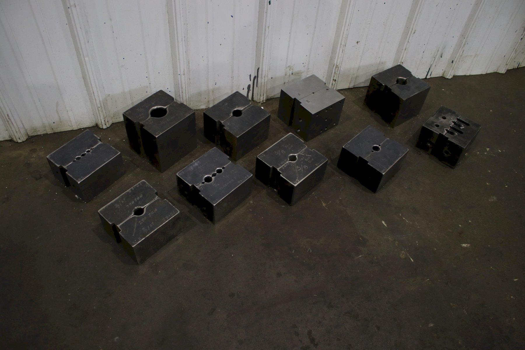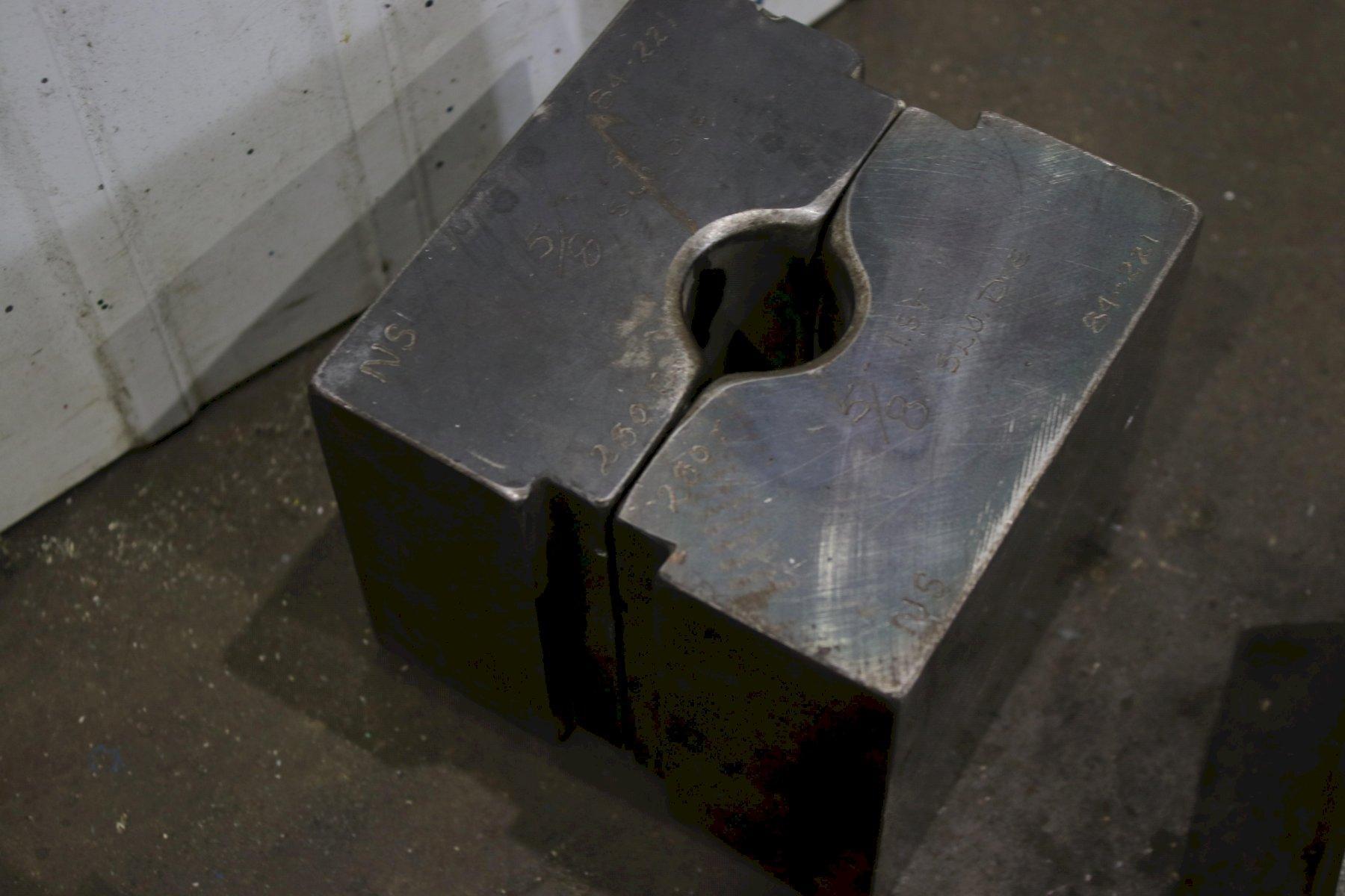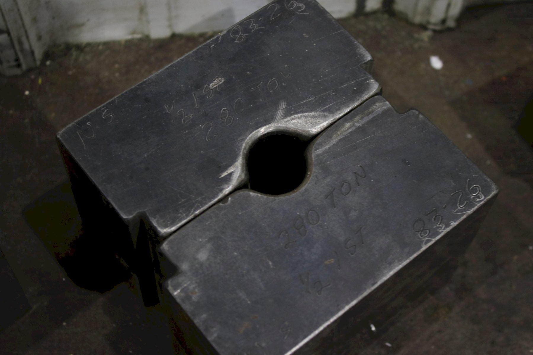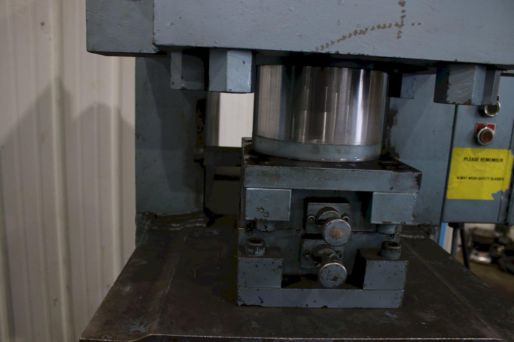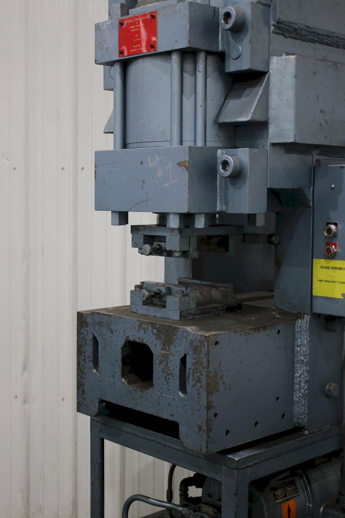 SERIAL .................... NS150-1-189 MODEL ..................... 150 CAPACITY .................. 150 TON STROKE .................... 4" CYLINDER DIAMETER ......... 7" ELECTRIC FOOT PEDAL ....... DUAL DIES SET WITH MACHINE ..... 1/8" & 3/16" DIE SET WITH MACHINE ...... 1/4",5/16" DIE SET WITH AMCINE ....... (3) @ 3/8" DIE SET WITH MACHINE ...... 5/8" & 3/4" MOTOR ..................... 7-1/2 HORSEPOWER |