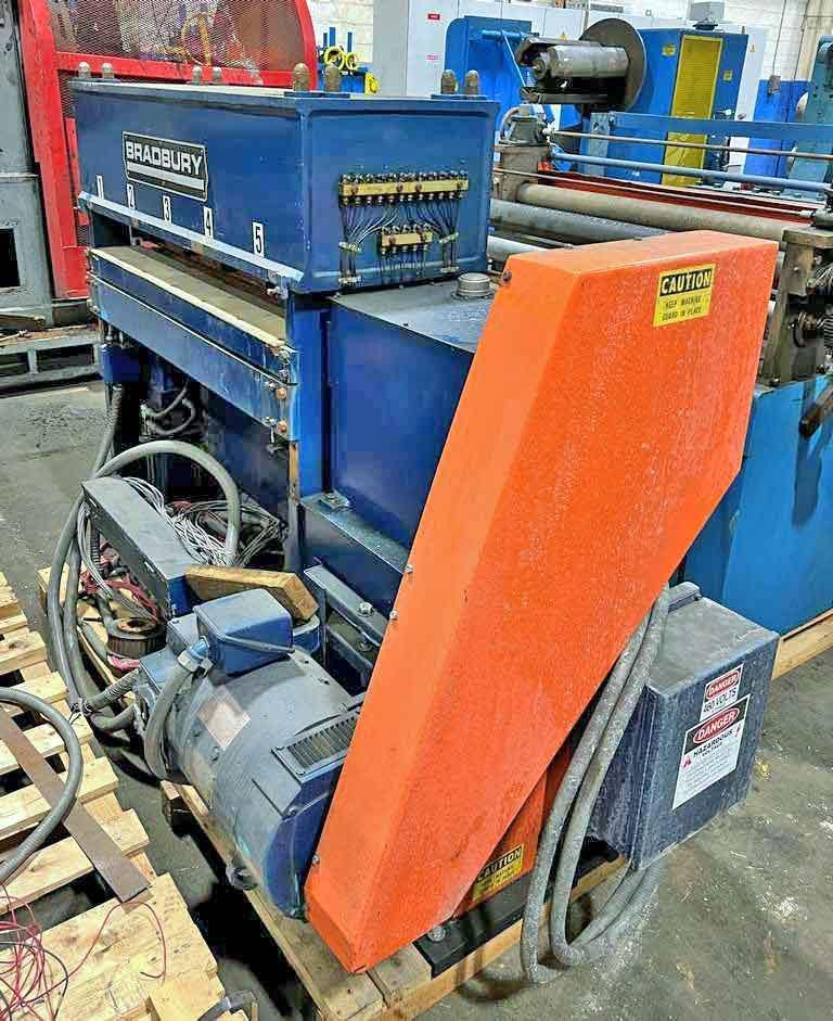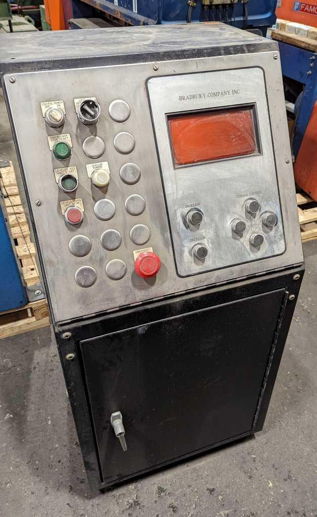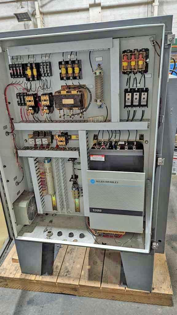 Material Width: 6" - 36" Material Thickness: 0.008" to 0.040" Material Yield: 50,000 PSI Maximum, 30,000 PSI Minimum Work Roll Number: 11 Work Rolls, 5 over 6 Work Roll Size: 0.875" Diameter x 44" Face Work Roll Centers: 1" Backup Flights: 5 Main Drive Motor: 15 HP DC, 1750/2300 RPM, 500 V Line Speed: 0 to 100 FPM Maximum Passline Height: 40" Intermediate Rolls: 5 HI Leveler Allen-Bradley 1395 Drive Includes Operators Control Panel Overall Size: 83" L x 40" W x 60" High |