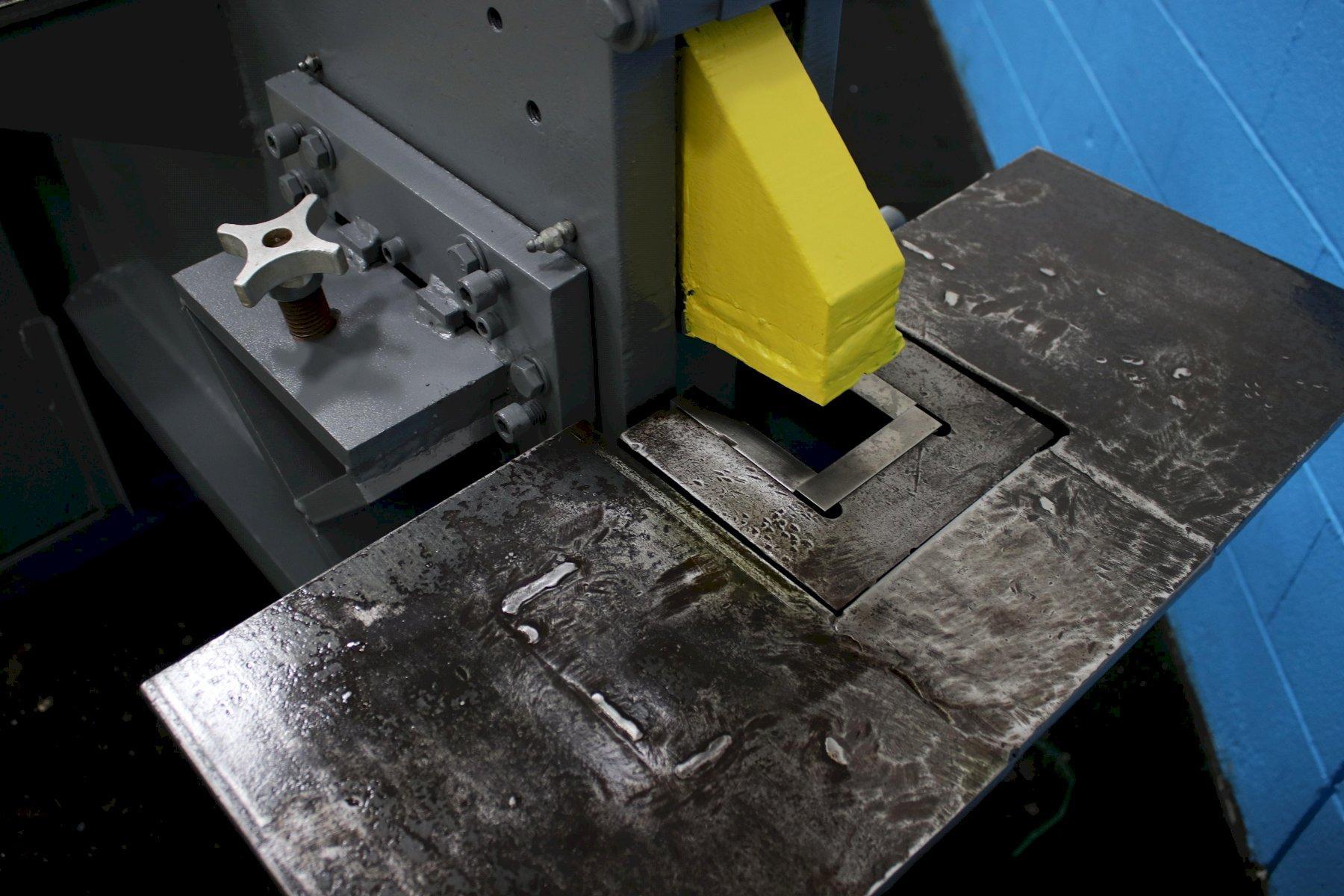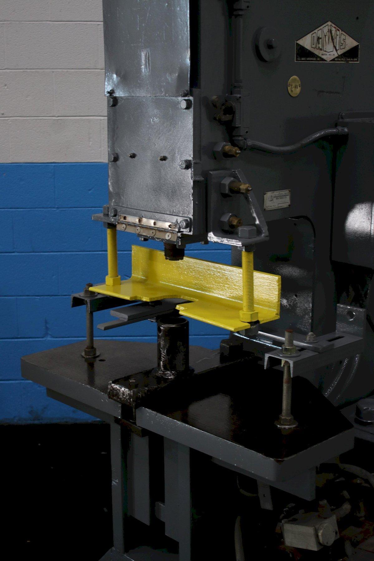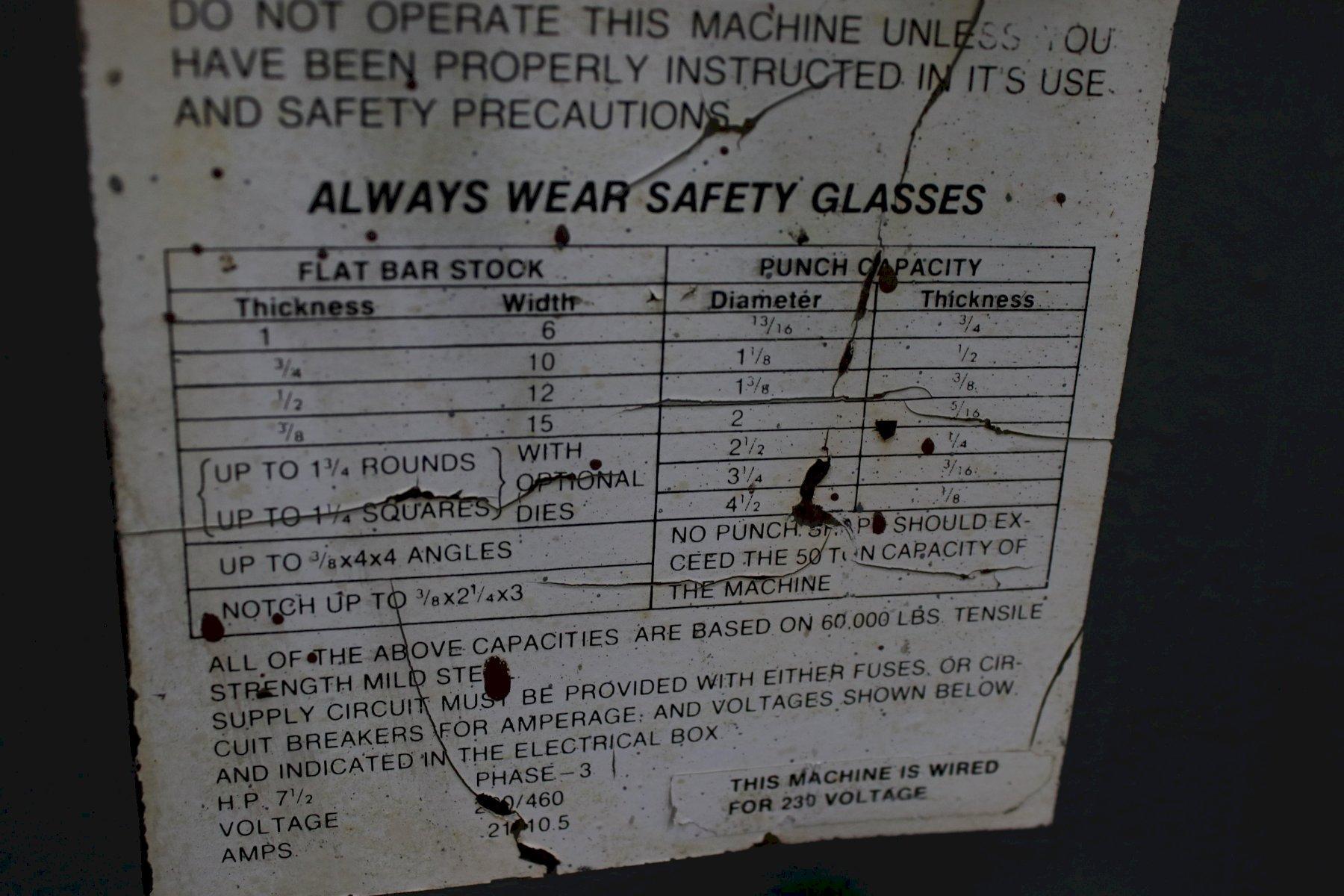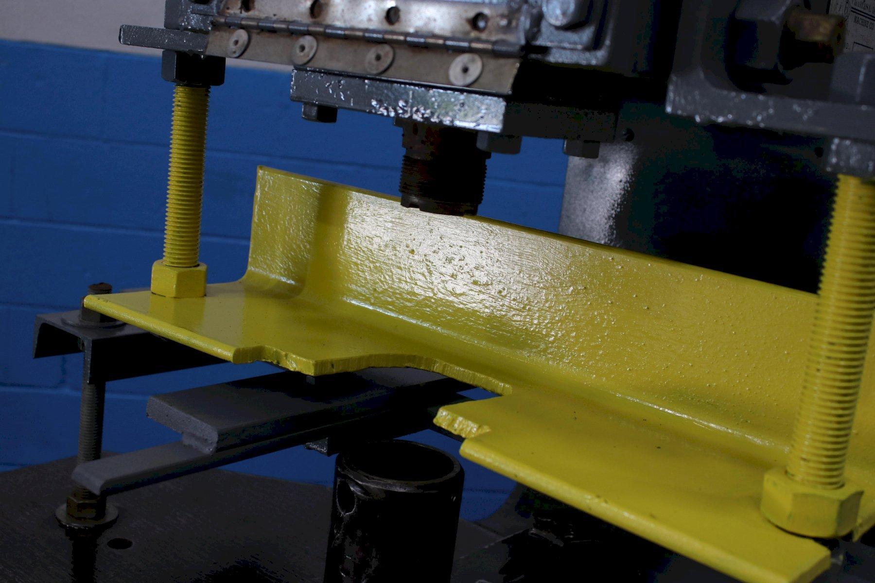 SERIAL .......................... 7-1-765 MODEL............................ M150A CAPACITY ........................ 70 TON PUNCHING CAPACITY ............... 1-3/16" IN 3/4" AREA OF BED ..................... 36" X 10" DEPTH OF THROAT ................. 14-1/2" SHEAR FLATS ..................... 24" X 1/4" TO 6" X 1" LENGTH OF BLADES ................ 24 STROKE .......................... 6" ANGLE SHEAR CAPACITY ........... 4" X 4" X 3/8" ROUND BARS ...................... 1-3/8" SQUARE BARS ..................... 1-1/4" COPING .......................... 2-1/4" X 3" X 3/8" STROKES PER MINUTE ............. 30 FOOT PEDAL....................... YES DUAL RAMS ....................... YES MOTOR ........................... 7-1/2 HORSEPOWER |