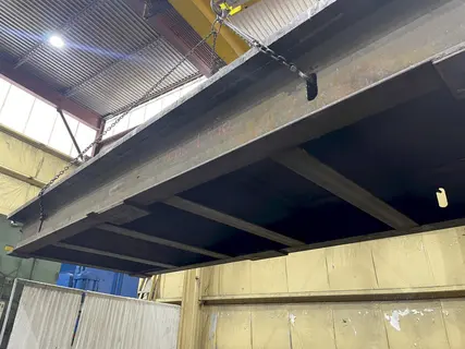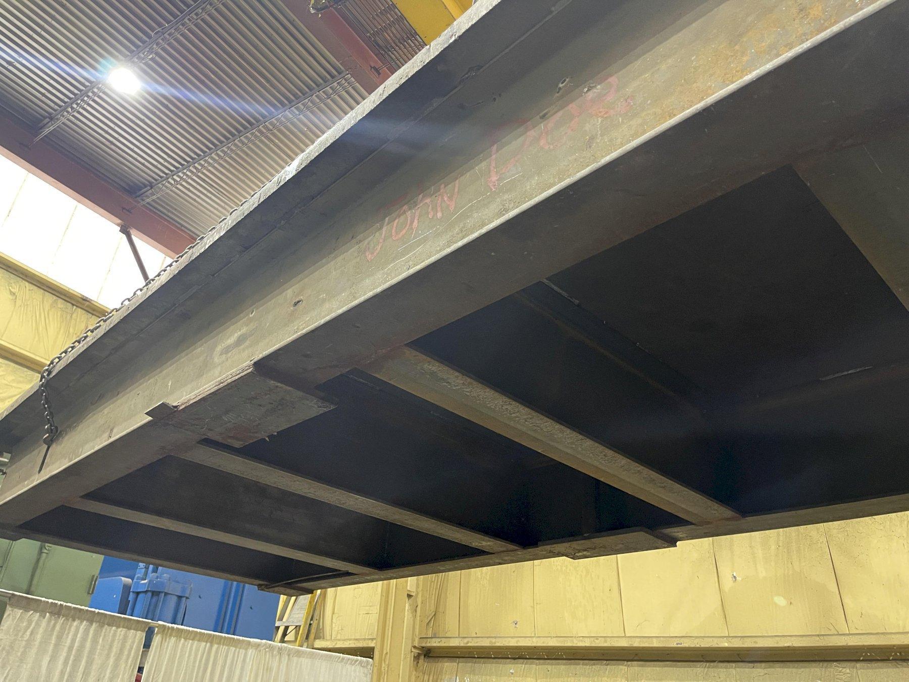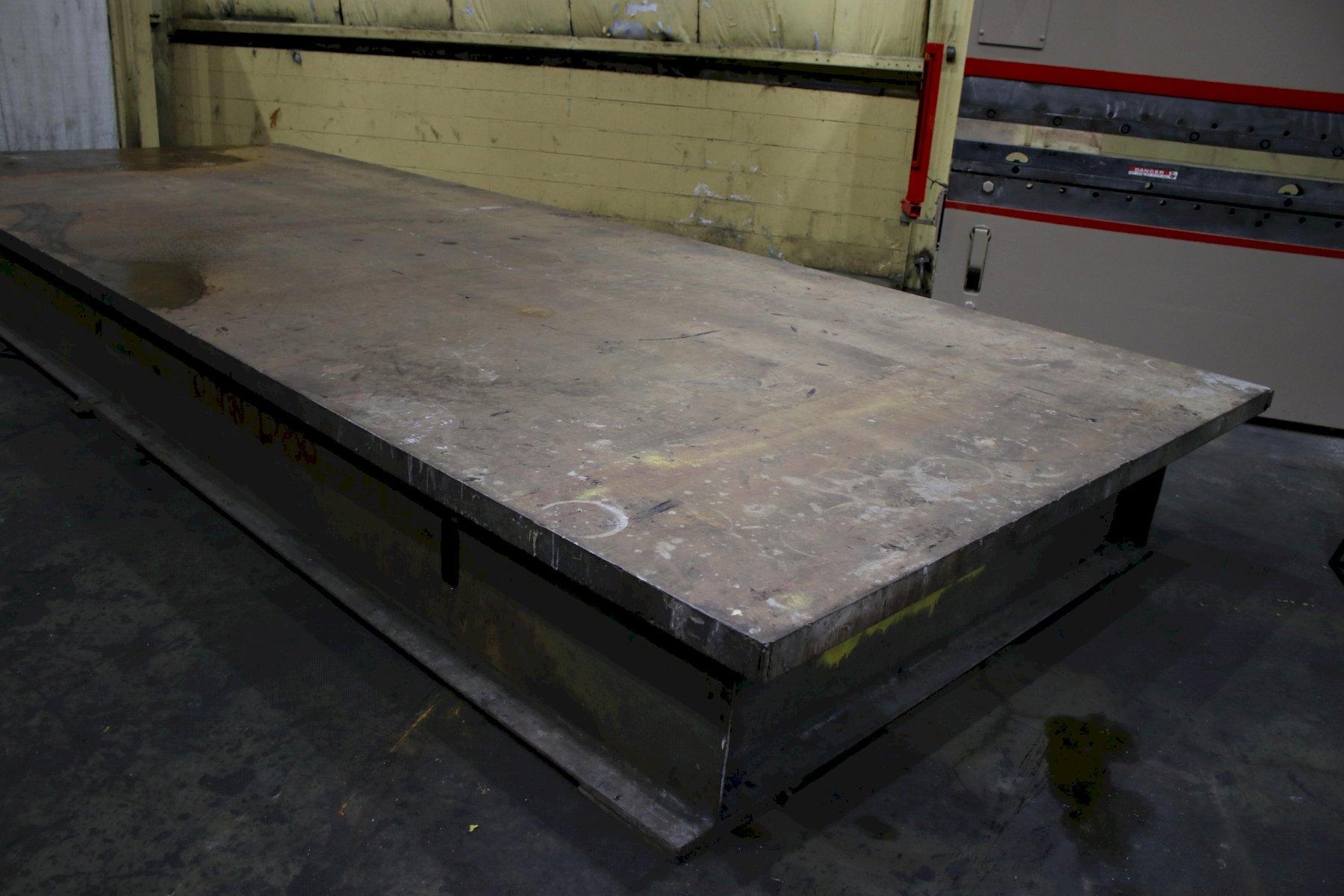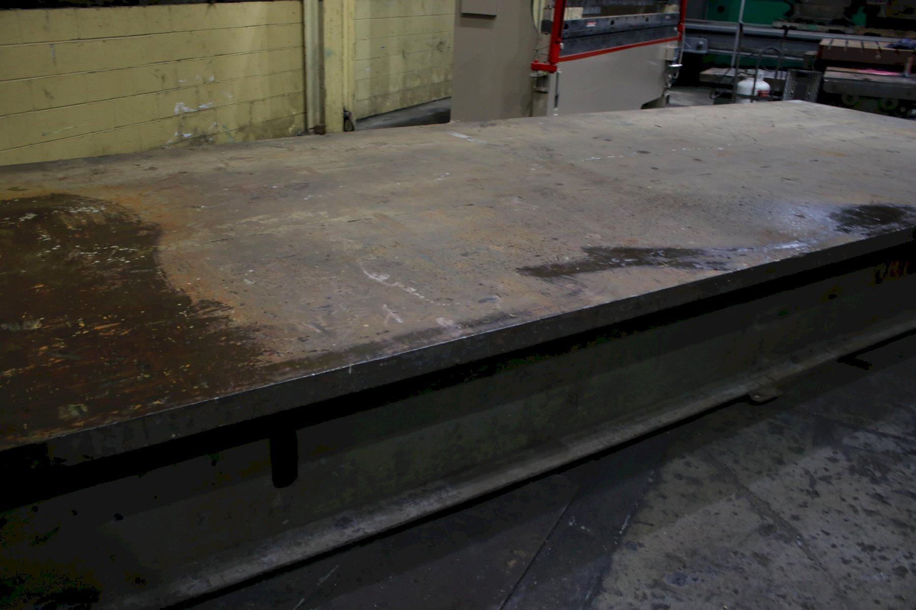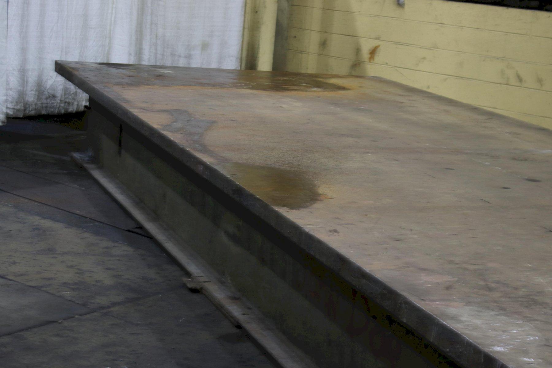 LENGTH OF PLATE .............. 257" WIDTH OF PLATE ............... 99-1/4" PLATE THICKNESS .............. 3" HEIGHT ON STAND .............. 25-1/4" SOLID STEEL .................. YES WEIGHT OF PLATE ON STAND ..... 24,150 LB |